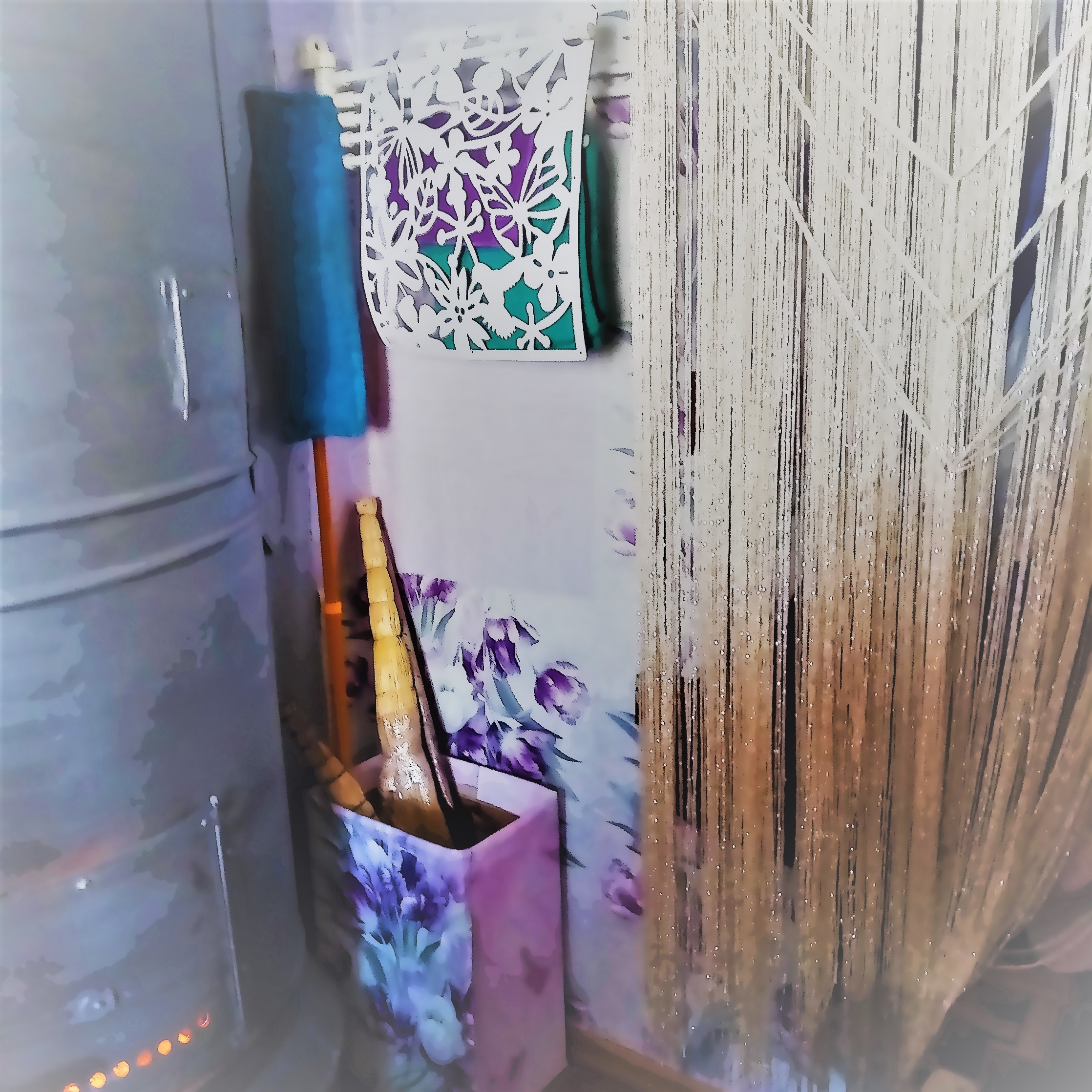На малюсеньком островке между печкой и вешалкой у меня поместились два веника, совок, дровница, швабра для мытья полов, вешалка для просушивания хозяйственных тряпок.