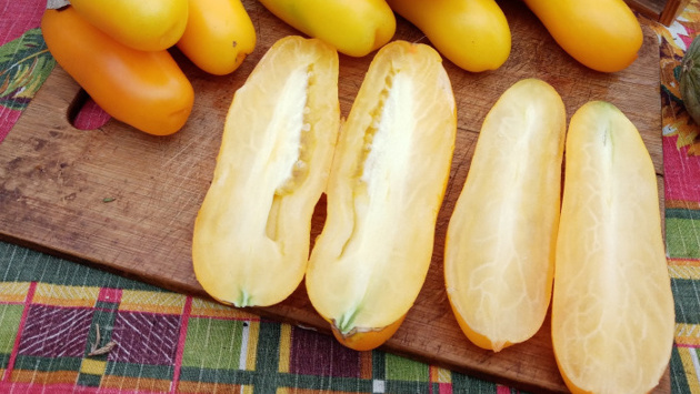 Плоды у 'Бананчика' не то что удлинённые, а прям длинные — 10-15 см в длину, даже до 20 см вырастают! Цвета ярко-жёлтого, довольно увесистые, по 100-200 г.