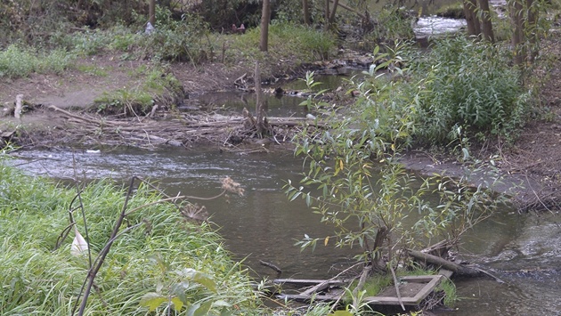 Приглядевшись, становится понятно: сотрудники подрядчика стараются обходить не только металл, но и вросшие в дно неглубокой речки автомобильные покрышки и пластиковые конструкции.
