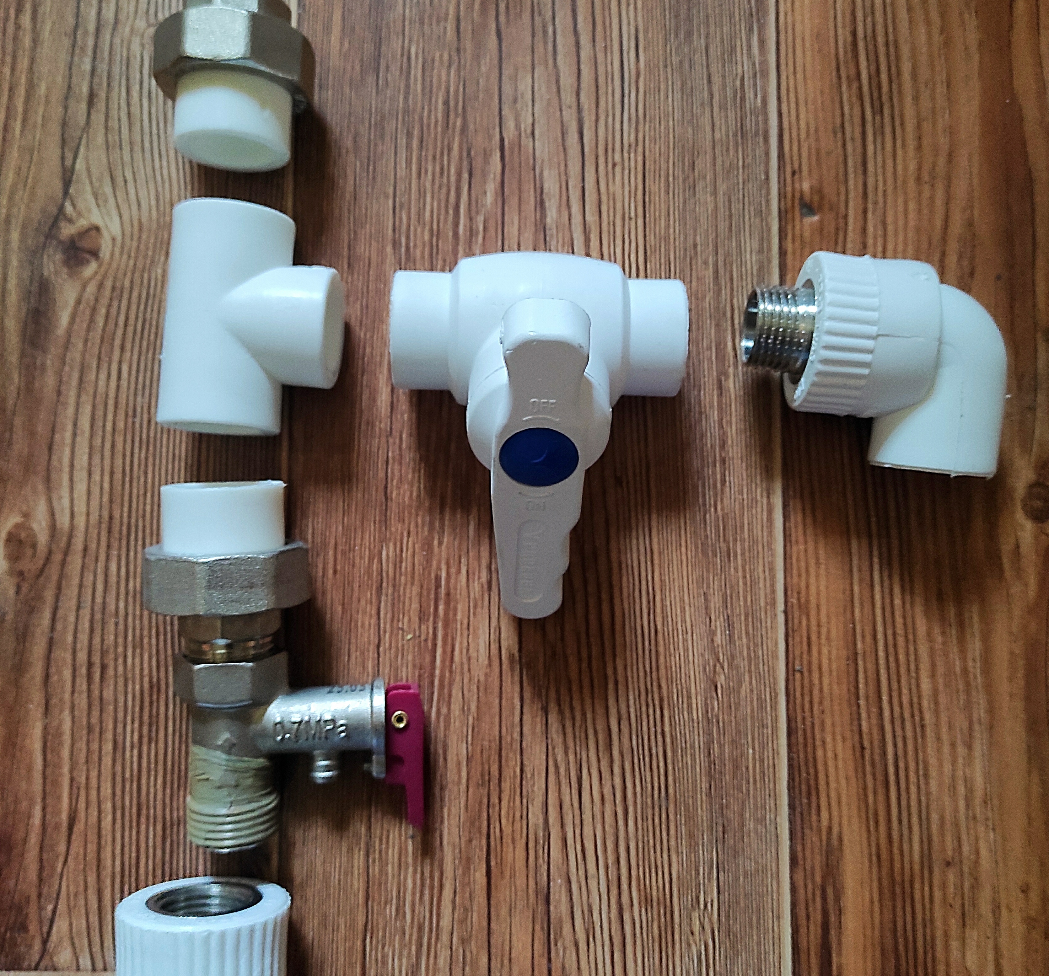 Для гармонии, к темной плитке выбрал белые трубы пвх. Перед тем, как начать пайку труб, я немного посмотрел видеоуроки, где показывают, как подключают водонагреватели — все они были похожи один на другой. Что-то я намотал на ус, что-то добавил своего: мне хотелось все краны и клапаны немного припрятать, и я их опустил вниз, чтобы они гармонично вписались в общий интерьер помещения.