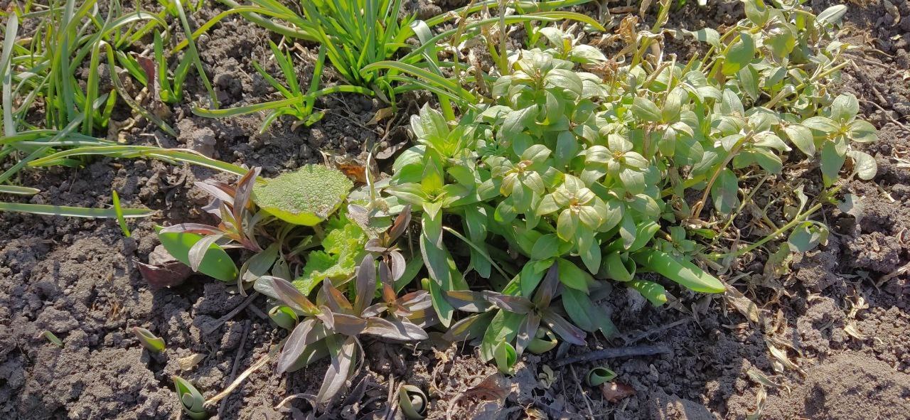 На даче всё зелёное, земля успела просохнуть и даже местами высохнуть (но скоро обещают дождь со снегом). За грядки я прямо с размаху браться не стала, а то бы на них и осталась, но вот на клумбах пришлось заняться прополкой. На них уже вовсю повылезала то ли звездчатка, то ли мокрица, в общем, плоская травка с длиннющим и тонким как волос корнем. Выполоть её нереально, и в список самых злостных врагов я её не заношу лишь потому, что она в небеса не рвётся: ползает себе потихонечку, почвопокровник корчит.