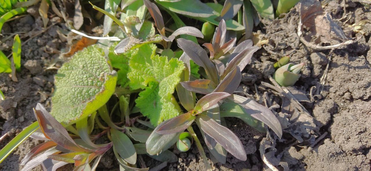 То, что затесалось в серёдке, подозреваю, лопух — но возможны варианты. Большой зелёный кустик явно перенёс зиму, я с него обрезала подсохшие стебли. И кем он может быть? В том году я примерно в это место высаживала несчастную рассаду, но из неё хоть как-то выросли только сальвии и ротики, они же львиные зевы. Сальвии оказались многолетними?