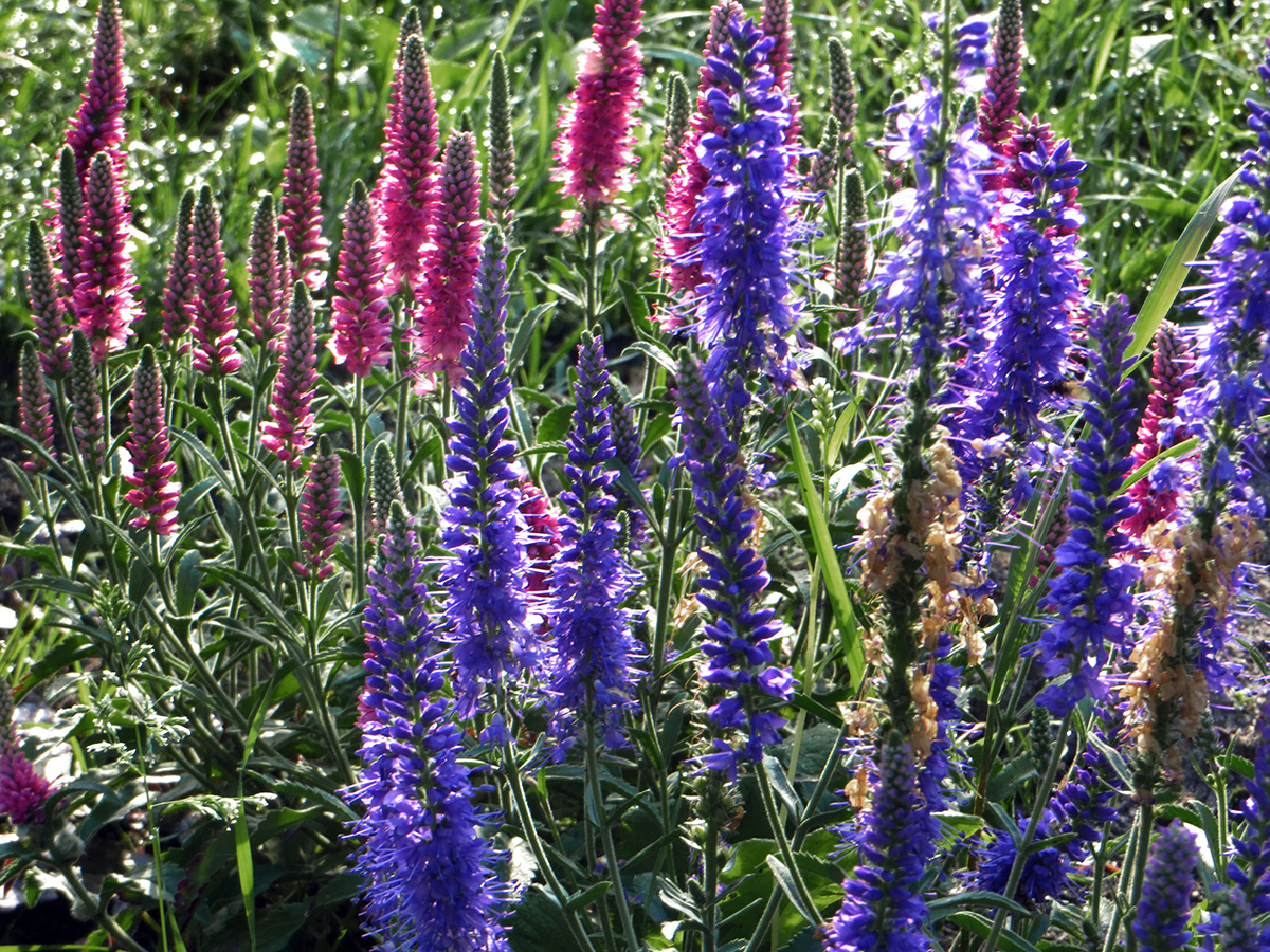 Я сразу ее вспомнила! Эта вероника мне так понравилась! Я тогда купила на пробу две эти вероники и две какие-то еще, другого сорта, мне они не понравились. Мелкие колоски, невнятного грязного цвета (для меня чистый цвет — это цвет, который не производит ощущения вылинявшего, многократно стиранного, с неприятной серятиной). А эти — невысокие, и колоски чистого цвета чуть с серебринкой от тоненьких волосков. Она у меня исчезла, когда в один из сезонов надолго затопило не только газон, но все миксы.