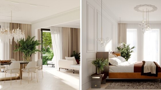 Внутреннее пространство дома не менее впечатляюще: лобби с камином, фитнес-зона для резидентов и уютное патио во дворе. Дизайн интерьеров разработан известным британским бюро 1508 London. Семейные резиденции площадью от 118 кв. м до 346 кв. м с украшены дорогими натуральными материалами и тканями бренда Loro Piana. В квартирах предусмотрены дровяные камины с порталами из мрамора, панорамное угловое остекление, балконы с видом на сад, парадная кухня и кухня для повара, просторные гардеробные, паркет из светлого дуба, кухни итальянского производства, премиальная бытовая техника и сантехника мировых брендов.