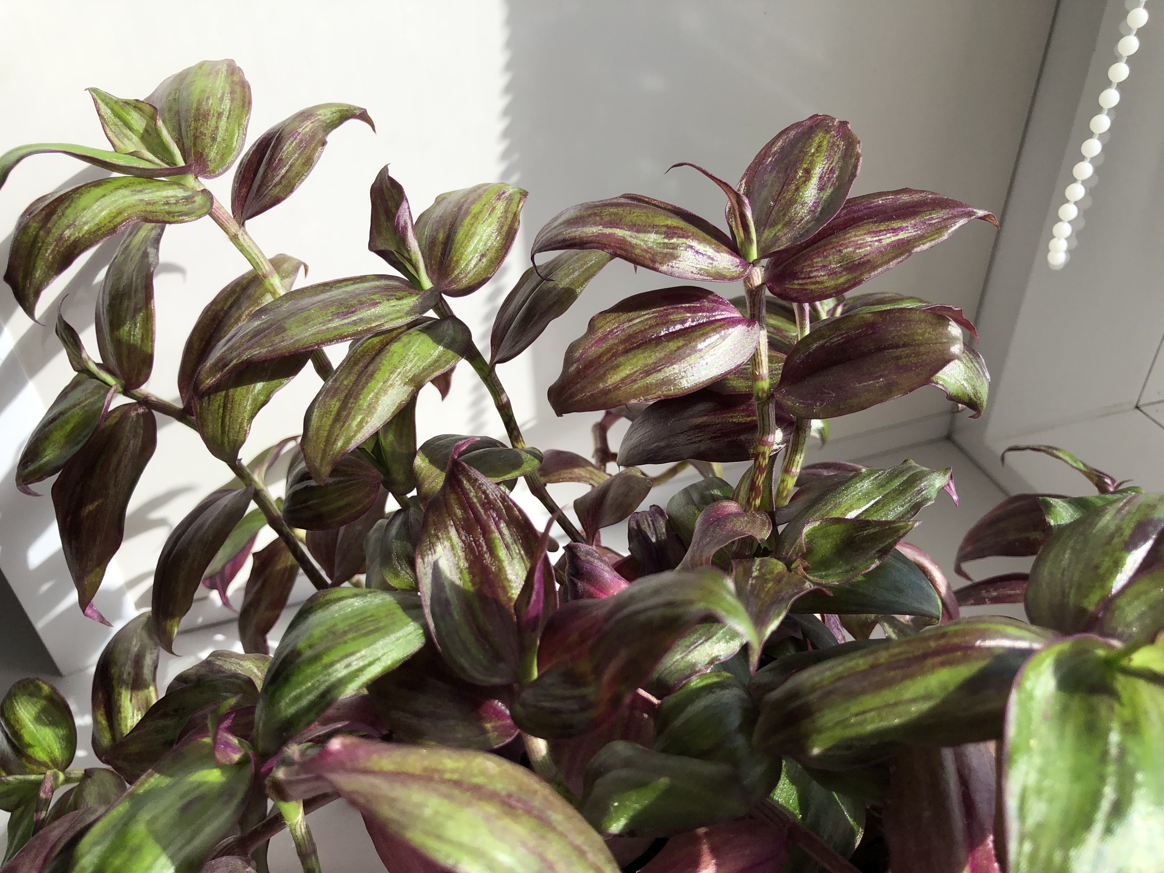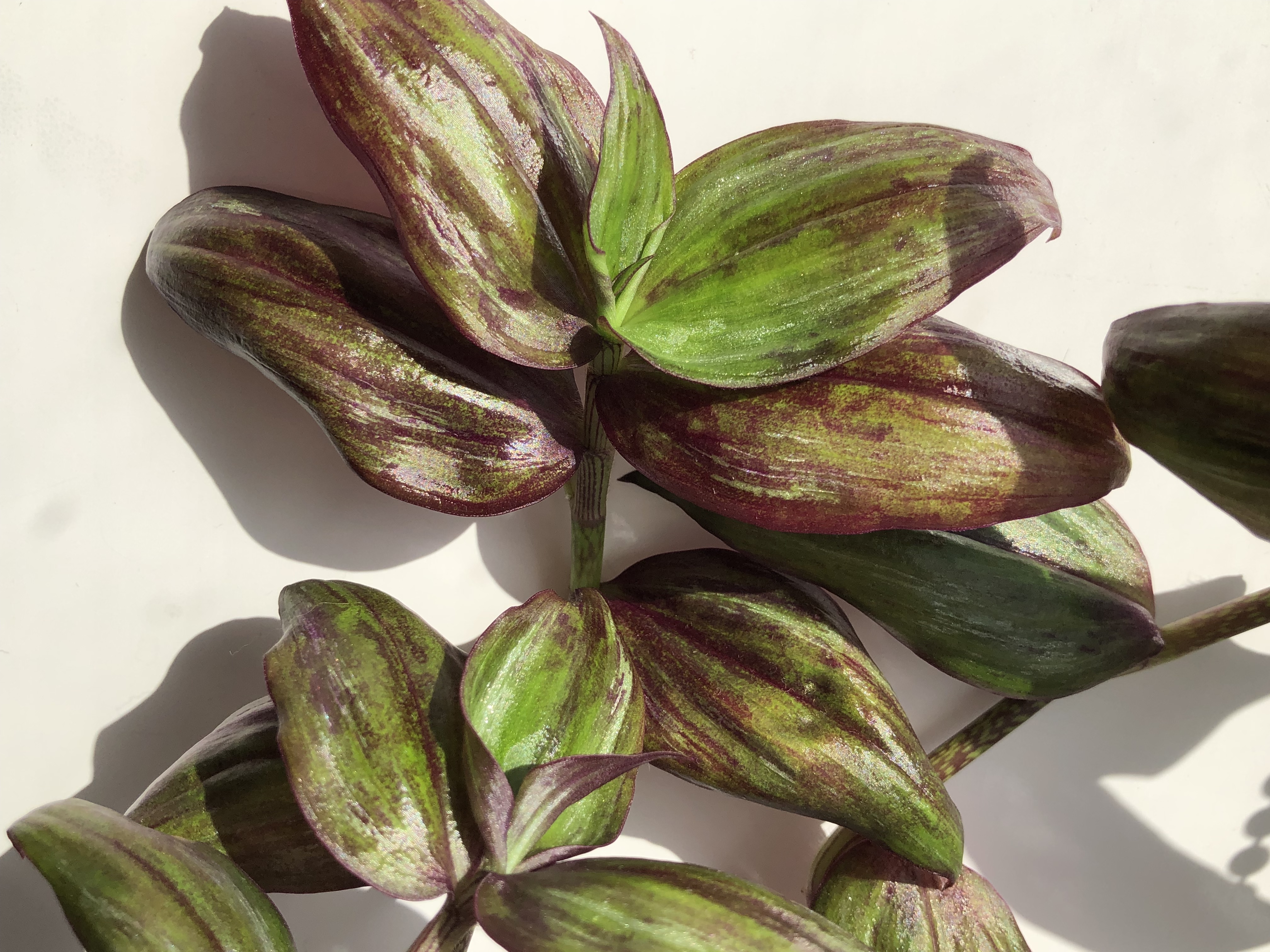 Интенсивность проявления зеленого и фиолетового цвета на листве напрямую зависит от степени освещения. Чем ярче свет, тем больше проявляется фиолетовый оттенок. Чем меньше света, тем более зеленой становится листва. Таким образом на одном растении могут быть листья с разной насыщенностью зеленого и фиолетового цвета. Когда мне подарили черенки, я даже подумала, что это от двух разных сортов. Оказалось, что просто черенки срезали как с верхних побегов, которые получали максимум света, так и с нижних, которым доставалось света меньше.