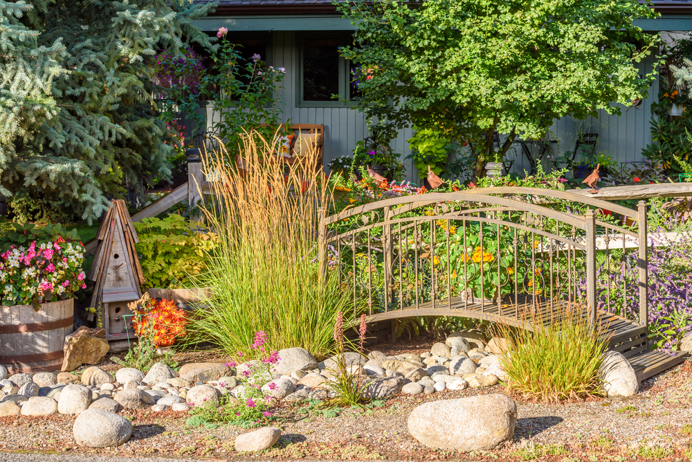 Помните про окружение нового ландшафтного элемента сада. К примеру, сухой ручей не может брать начало прямо от забора или строения. Если получается разместить его только в непосредственной близости от такого объекта, лучше завуалируйте такой «исток» посадками фоновых растений, например разноуровневой композицией из декоративных кустарников или раскидистых многолетников, чтобы создать впечатление, будто русло начинается где-то за ними.