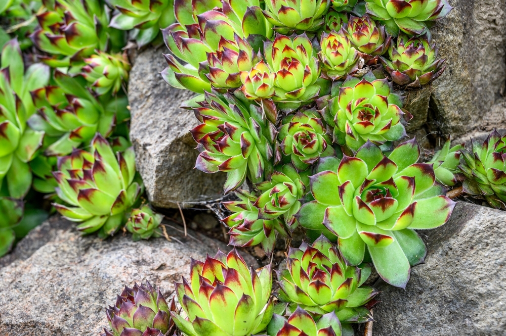 весьма эффектно сочетается с камнем, но важно понимать соответствие посадок растений задумке. Обыграть россыпь камней различными формами молодила возможно, но соседство этого растения с «прибрежными»