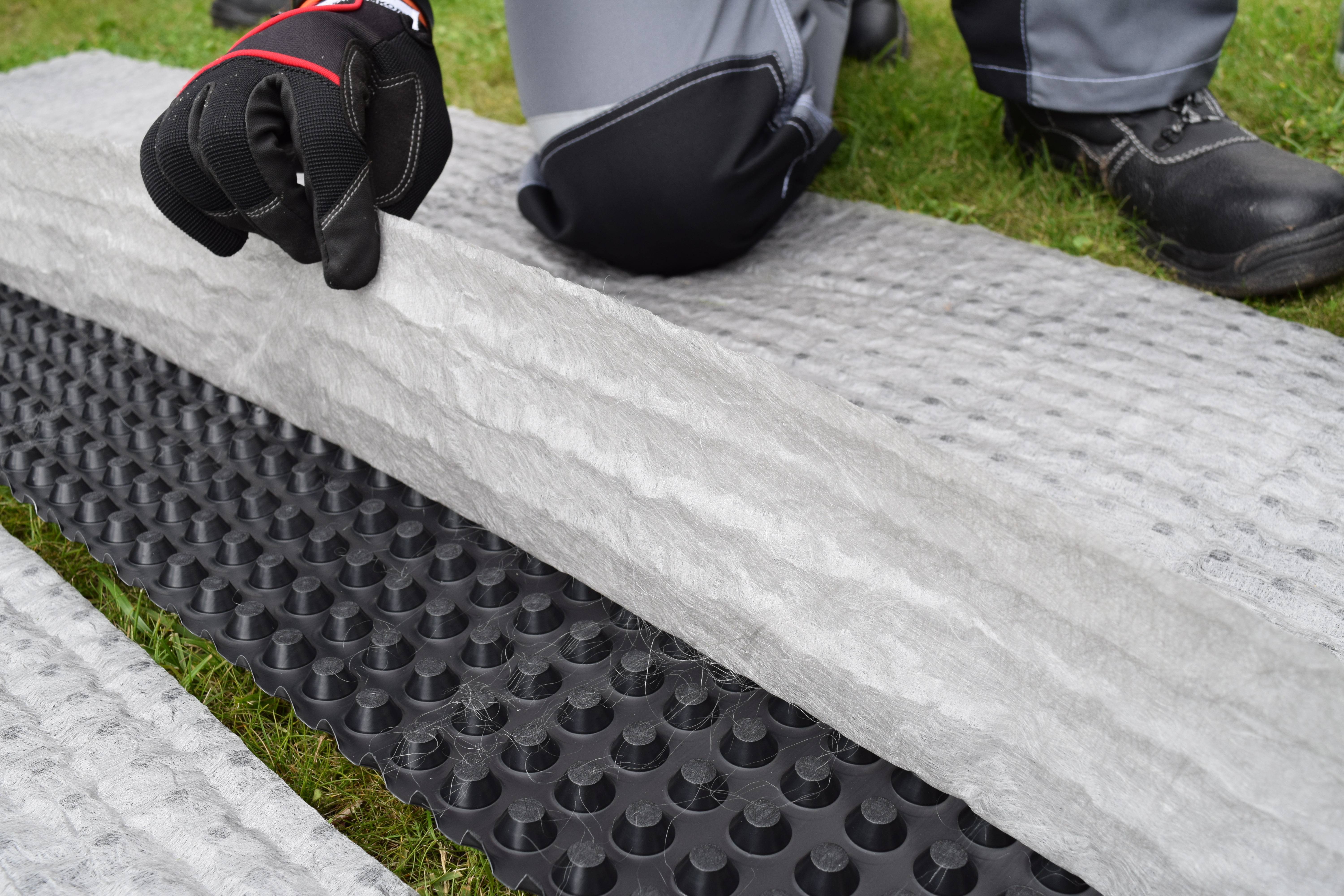 предназначена именно для этой цели. Она представляет собой полотно из полиэтилена повышенной плотности с конусообразными выступами высотой 8,5 мм и прочного термоскрепленного геотекстиля.