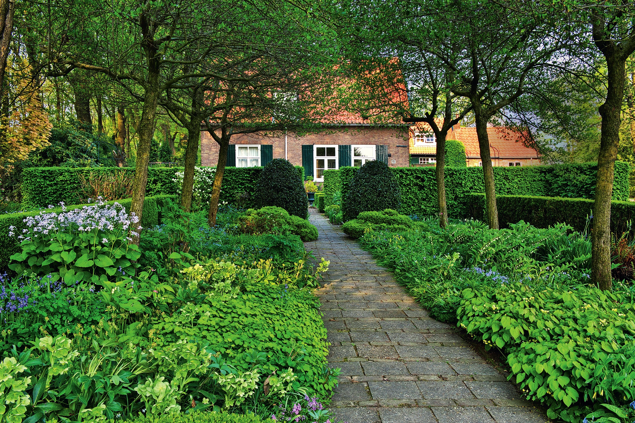 На фото: вдоль дорожки к дому в два ряда выстроились величавые деревья. Под их сенью хорошо растут типичные для леса травянистые многолетники: