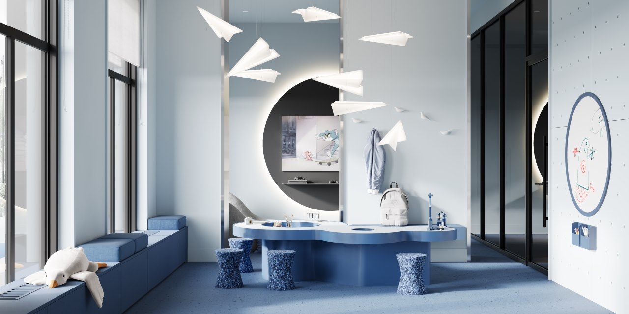 В нашем проекте детская комната, выполненная в спокойной голубо-синей гамме, помогает снизить напряжение, полученное в более активной игровой комнате.