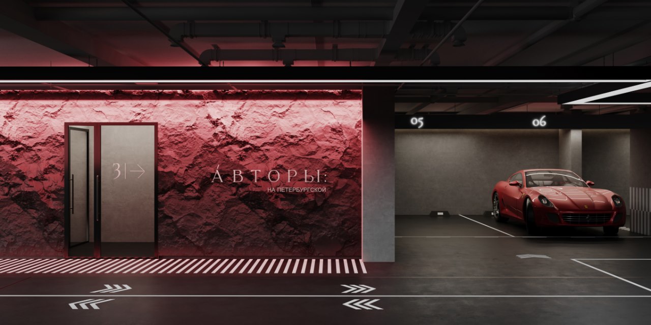 В проекте жилого комплекса в Казани мы создали контраст между гладким, блестящим лобби и брутальной зоной паркинга. На стене парковки разместили объемную скалу с цветной подсветкой, придав пространству суровый характер. Это контрастное решение помогает расставить акценты на важные для ориентирования зоны.