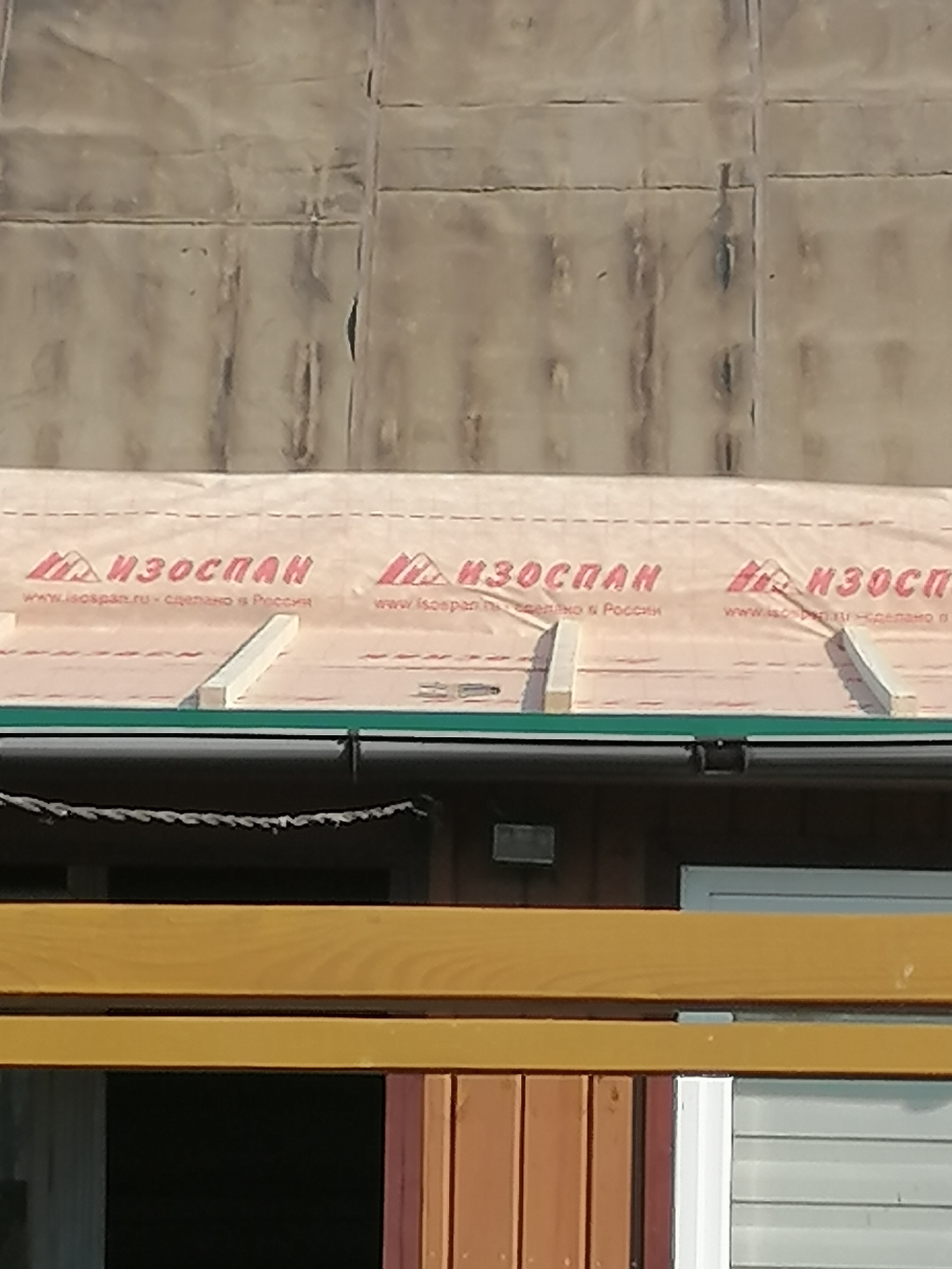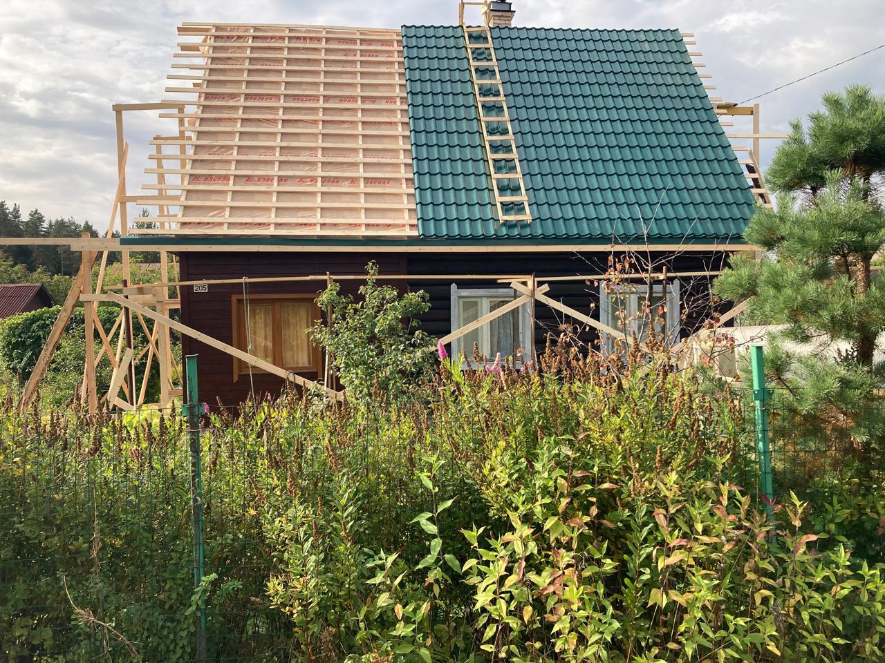 Рабочих было трое. Двое работали в основном на крыше, третий внизу, подай-напили-принеси. Работа шла достаточно быстро. Причём как-то делалось все одновременно. Укладывалась влагозащита поверх старого рубероида (муж так захотел), приколачивали обрешетку, тут же делались леса, чтобы снять старую вагонку с фронтонов.