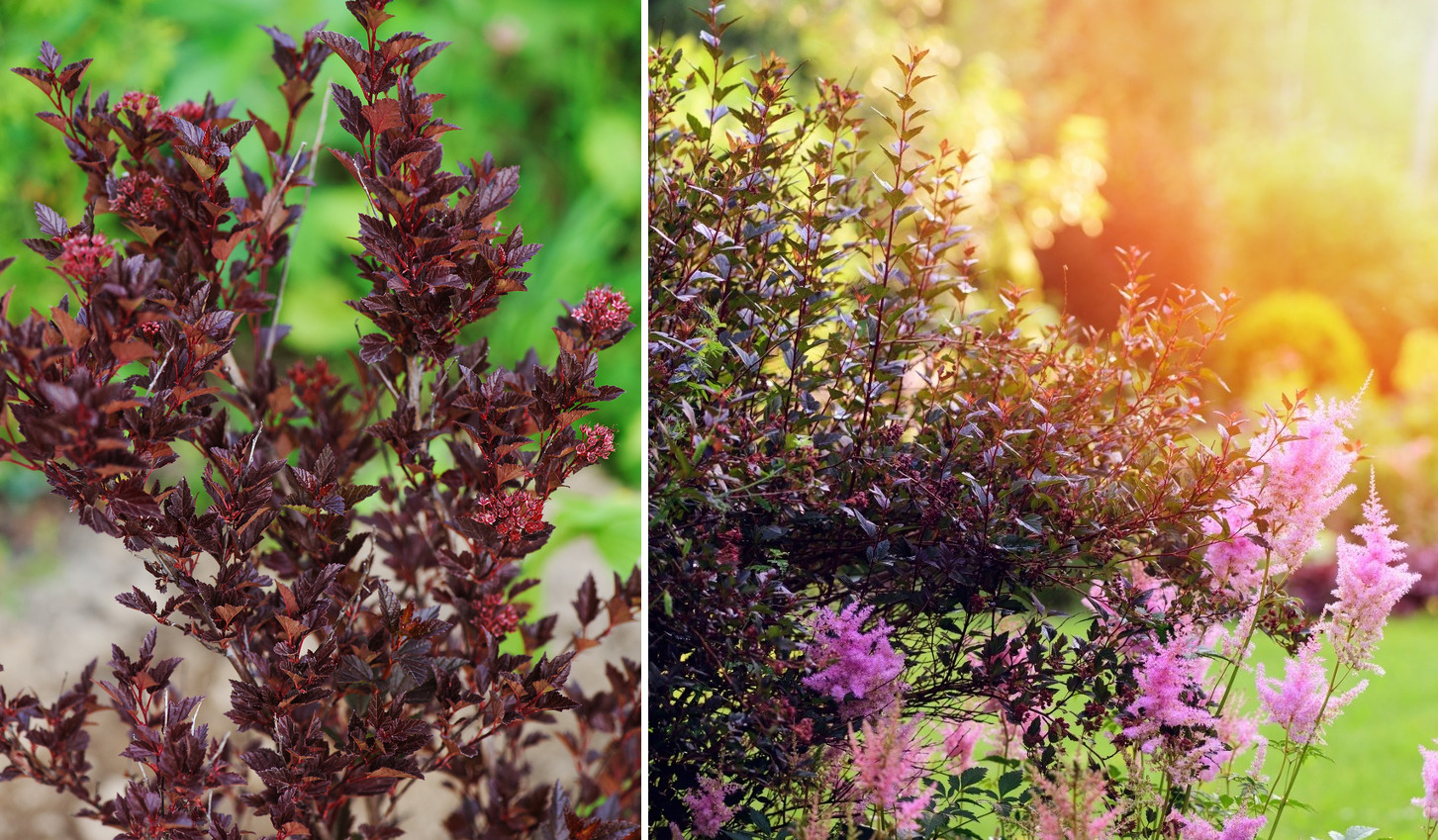 Краснолистные пузыреплодники роскошно смотрятся в контрастных растительных композициях.