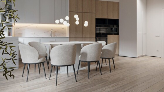 Кварцпаркет — это многослойное напольное покрытие на основе натурального дерева и молотого камня с высоким уровнем прочности и влагостойкости. Конструктивные особенности материала позволяют укладывать его без порогов на больших площадях — до 144 кв. м, что обеспечивает визуальную целостность интерьеров с открытой планировкой.