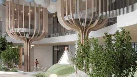 Центральная зона детского сада будет оформлена в стиле сказочного леса. Там же установят лестницу, соединяющую первый и второй этажи. На импровизированных деревьях расположатся домики для игр. Часть пространства займет зимний сад с настоящими растениями, где дети смогут гулять во время непогоды.
