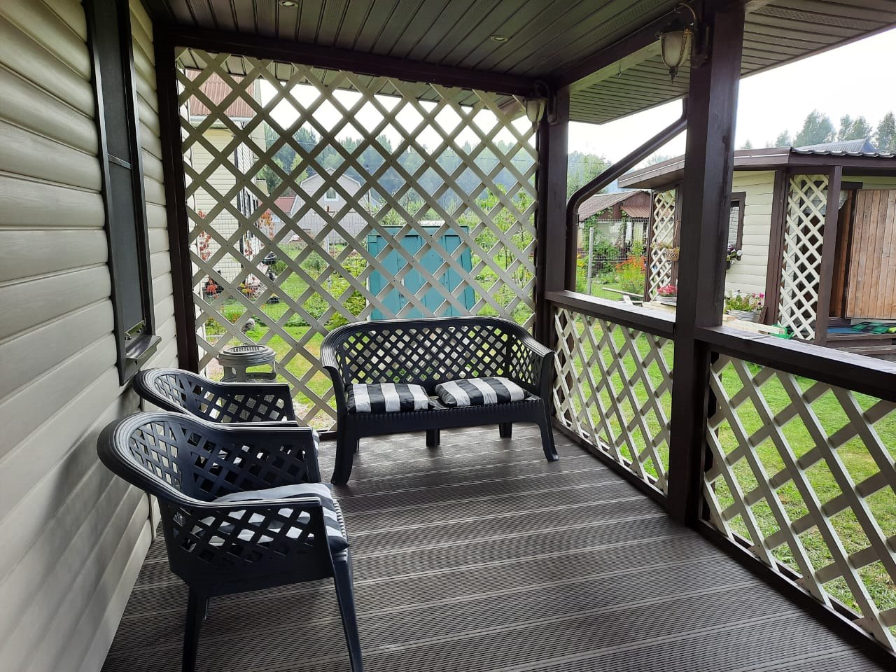 На террасе стоят два стула и больше ничего. Это вариант для тех, кто просто выходит посидеть на свежем воздухе с книгой и чаем. На террасу вмещают большой стол, мягкую мебель, гамак, диван-качели и мангал с разделочным столиком — когда хозяева по максимуму используют возможности террасы для отдыха и приятного времяпрепровождения.
