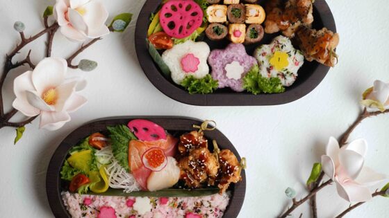 А для бенто с говядиной в бистро выбрали рулетики из говядины никумаки с фасолью, шашлычки из курицы, рулет тамагояки, салат с соусом гомадаре и милые разноцветные онигири в виде цветов с грибами. Вдохновившись сезоном цветения сакуры, оба цветочных бенто украсили разноцветными хлопьями фурикаке, цветами из дайкона и розовым маринованным лотосом.