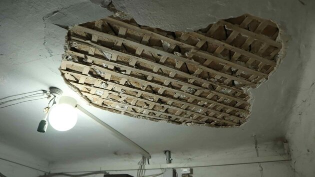 Прошлой осенью в первом подъезде едва не пострадал жилец дома. В нескольких сантиметрах от него упал 60-сантиметровый пласт штукатурки. В потолке дыра. Люди с опаской пробегают это место. Ведь ежедневно сверху летит строительный мусор – камни и деревяшки. Чтобы хоть как-то обезопасить жильцов от возможного обрушения, управляющая компания прикрепила тонкую фанеру. Капремонт крыши запланирован лишь на 2036 – 2038 годы.
