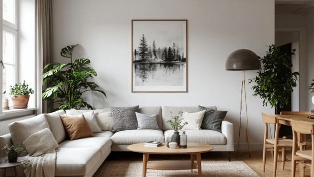 "Сканди-бохо" добавляет выразительные текстильные акценты, этнические мотивы и растения, привнося ощущение жизненной энергии. Здесь уместны яркие цвета в текстиле, плетеные кресла, столики из ротанга или бамбука.