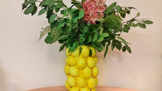Для этого участники отлили из гипса заготовки в форме лимонов, после высыхания покрасили их в жёлтый цвет и закрепили на стеклянной вазе. Получившийся трендовый элемент интерьера не только выглядит эффектно, но и прост в изготовлении.
