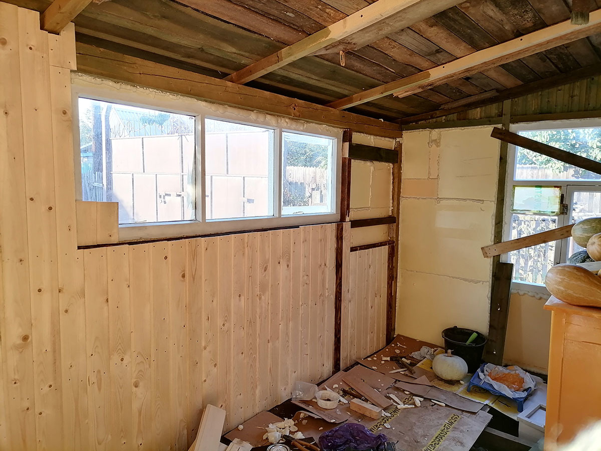 По мере подвоза материалов продвигались и работы. Тут уже начала обивать вагонкой изнутри: