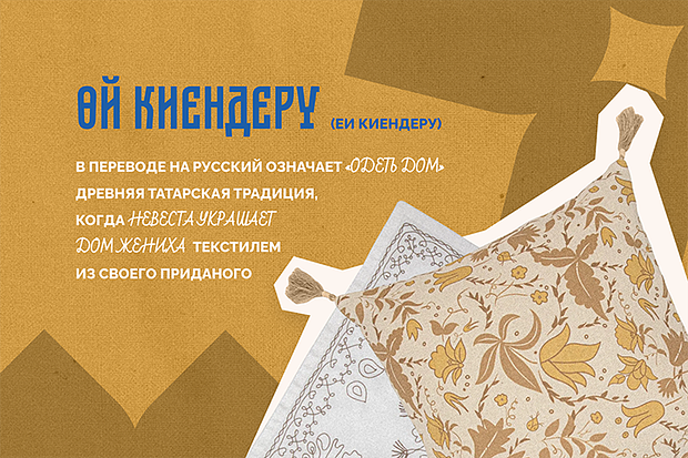 У татар есть старинный обычай — өй киендерү. Согласно ему, перед свадьбой невеста совершала обряд освящения дома жениха. Она вешала новые полотенца, настенные матерчатые украшения, красивые занавески, стелила матрасы и половики. Это называлось «одеть дом». Ритуал помогал девушке освоиться в новом жилище, а также показать родственникам жениха, какое у нее богатое приданое. Пару лет назад это выражение — «Одень свой дом» — взял за слоган казанский бренд Tatar Home, производящий предметы интерьера с национальным колоритом.