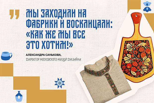 У меня любовь к народным промыслам случилась, когда меня пригласили курировать конкурс «Дизайн и ремесло: проСмыслы» в Нижегородской области. Вместе с другими дизайнерами мы поехали по фабрикам: Городец, Семеново, Чкалов. В каждом городе нам показывали, как создаются и сохраняются предметы декоративно-прикладного искусства. Поездка превратилась в шопинг-тур. Мы ехали в одном автобусе, а за нами двигался еще один автобус, набитый стульями с хохломской росписью, чкаловским гипюром, льном Александра Санькова директор Московского музея дизайна