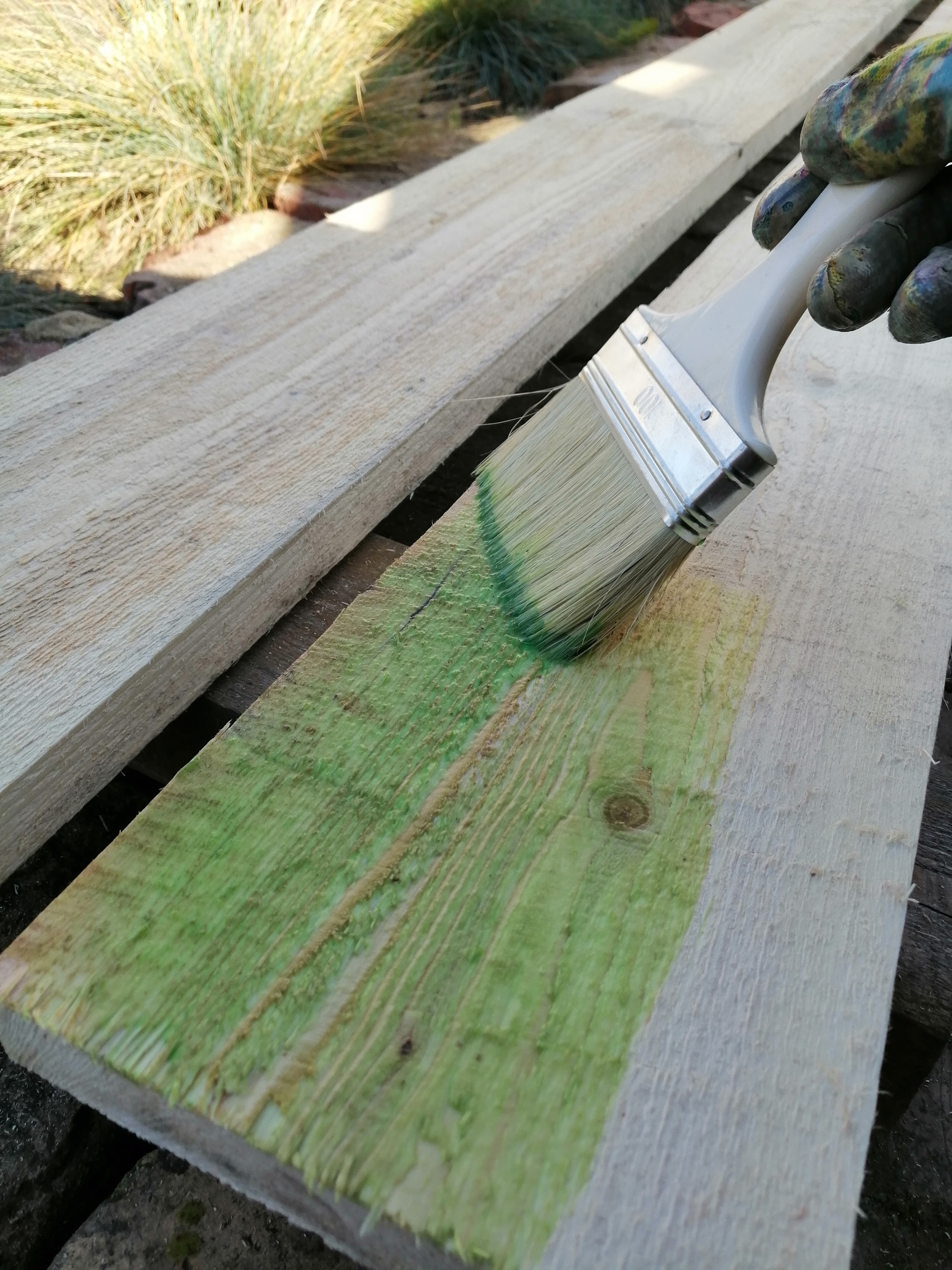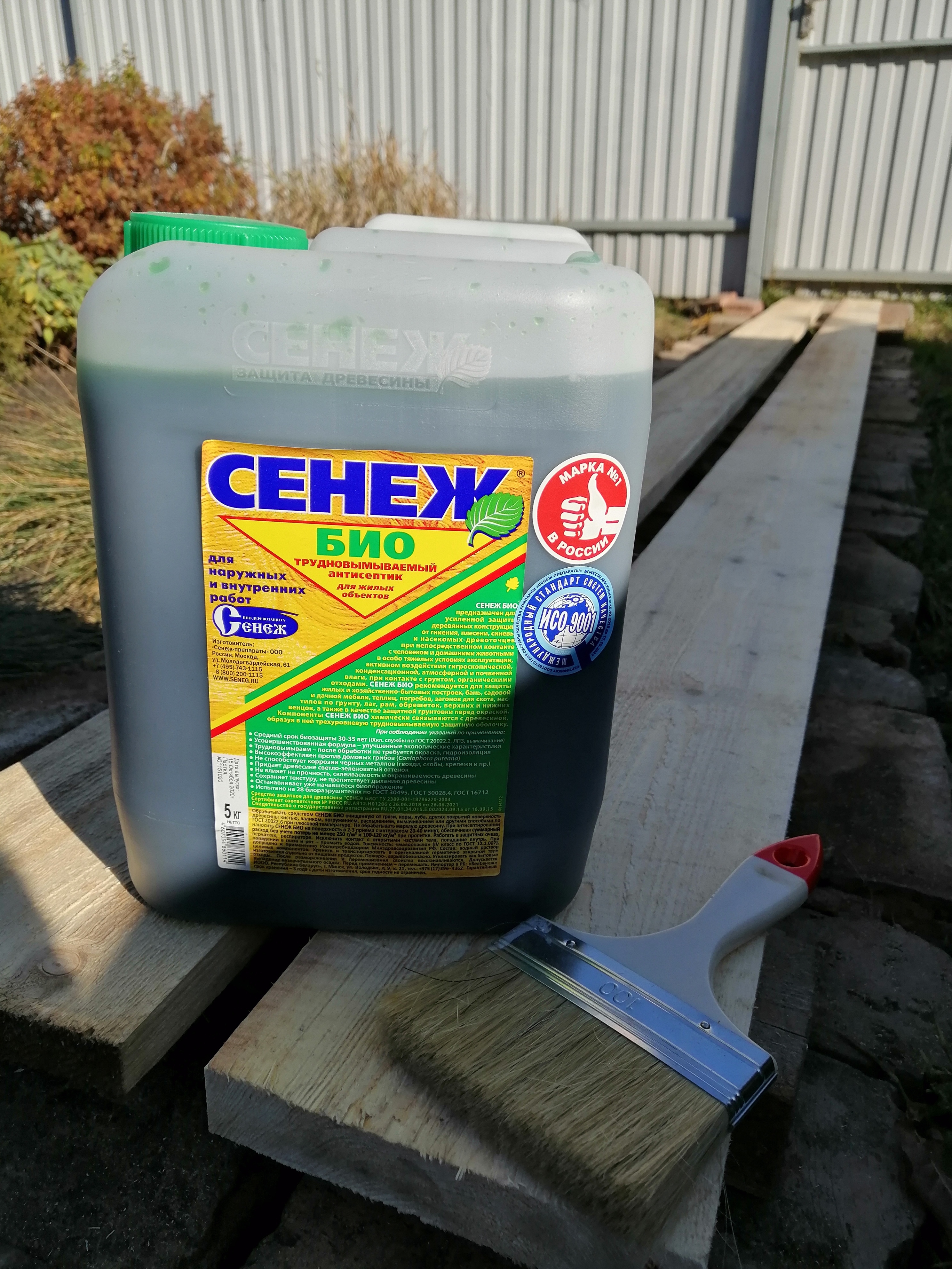 Покрывала доски в два слоя с перерывом между слоями примерно час. Покрывала трудновымываемым биоантисептиком «Сенеж», цвет у него классный, зеленый. При высыхании, конечно, цвет меняется немного.
