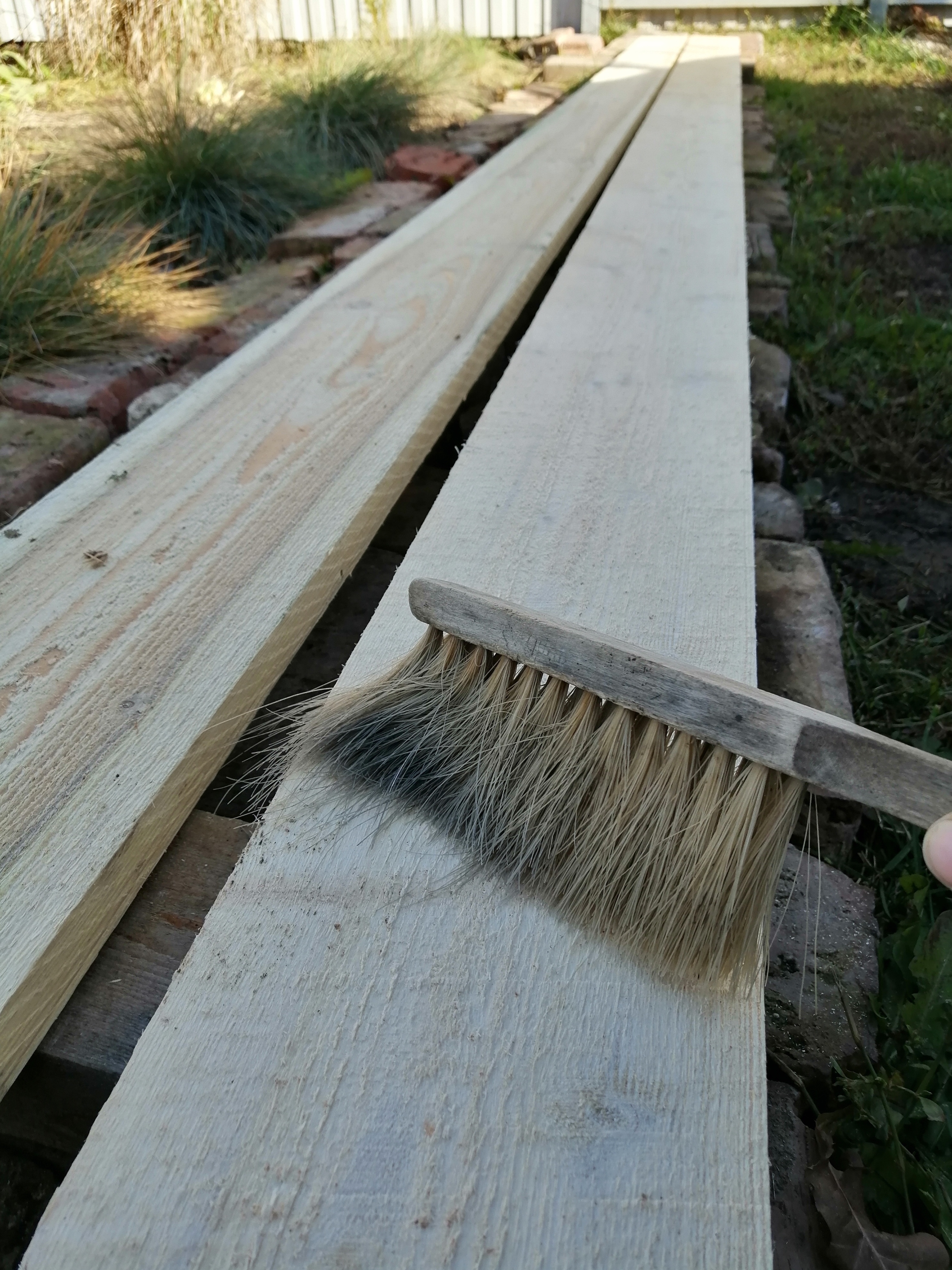 Приехав на участок, сразу приступили к распилу и пропитке древесины. Перед покрытием очистила поверхность с помощью щетки.