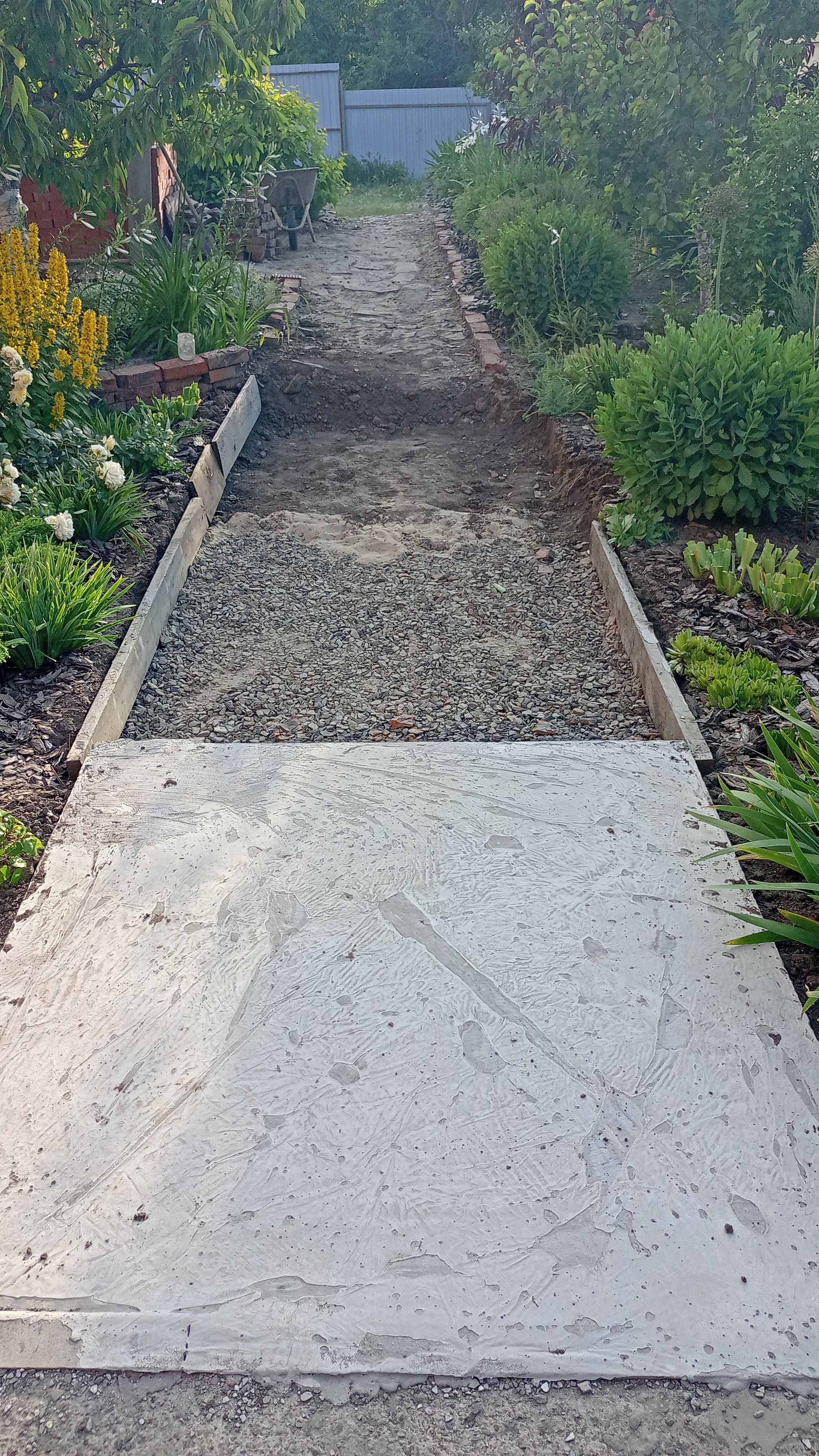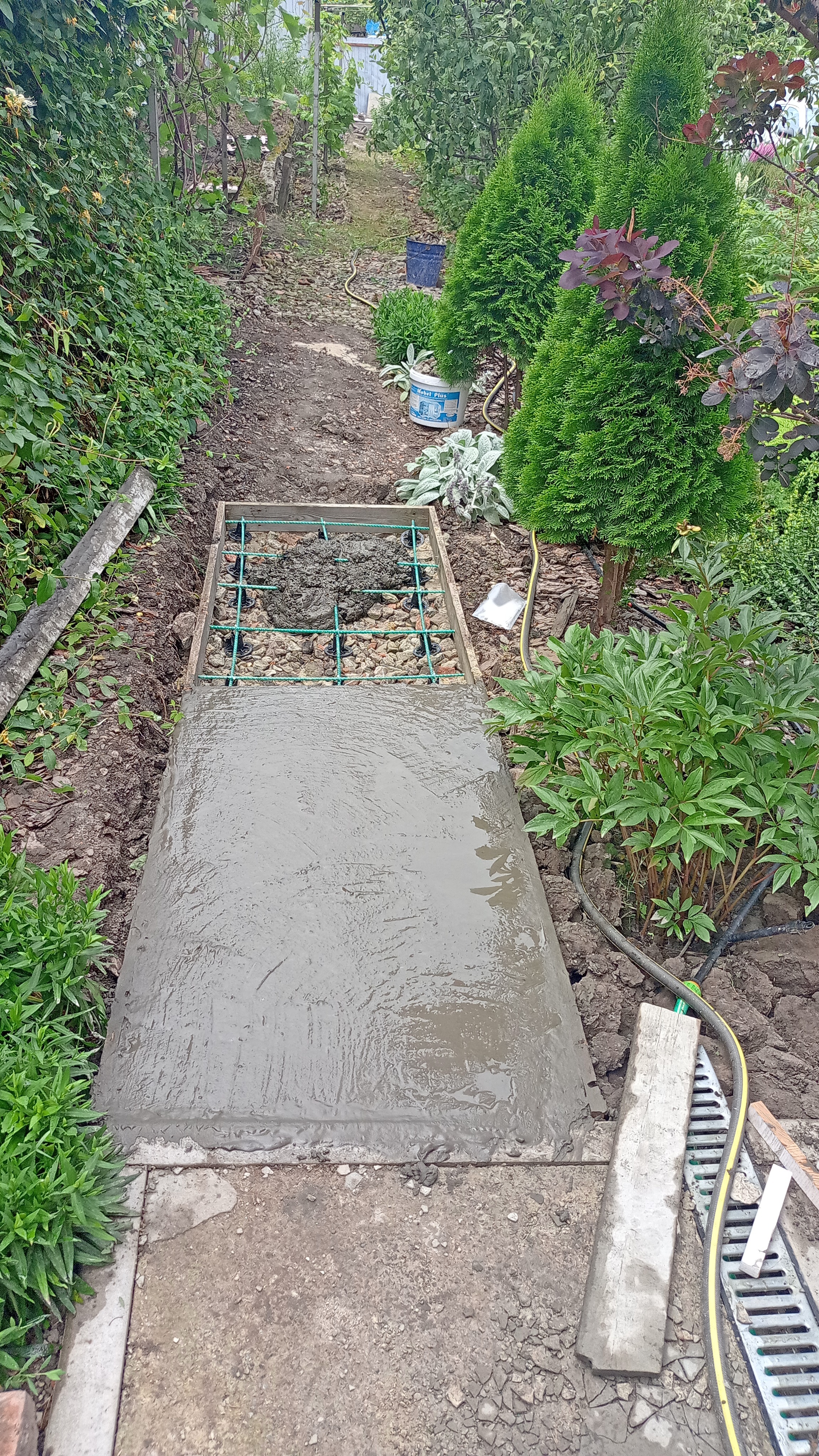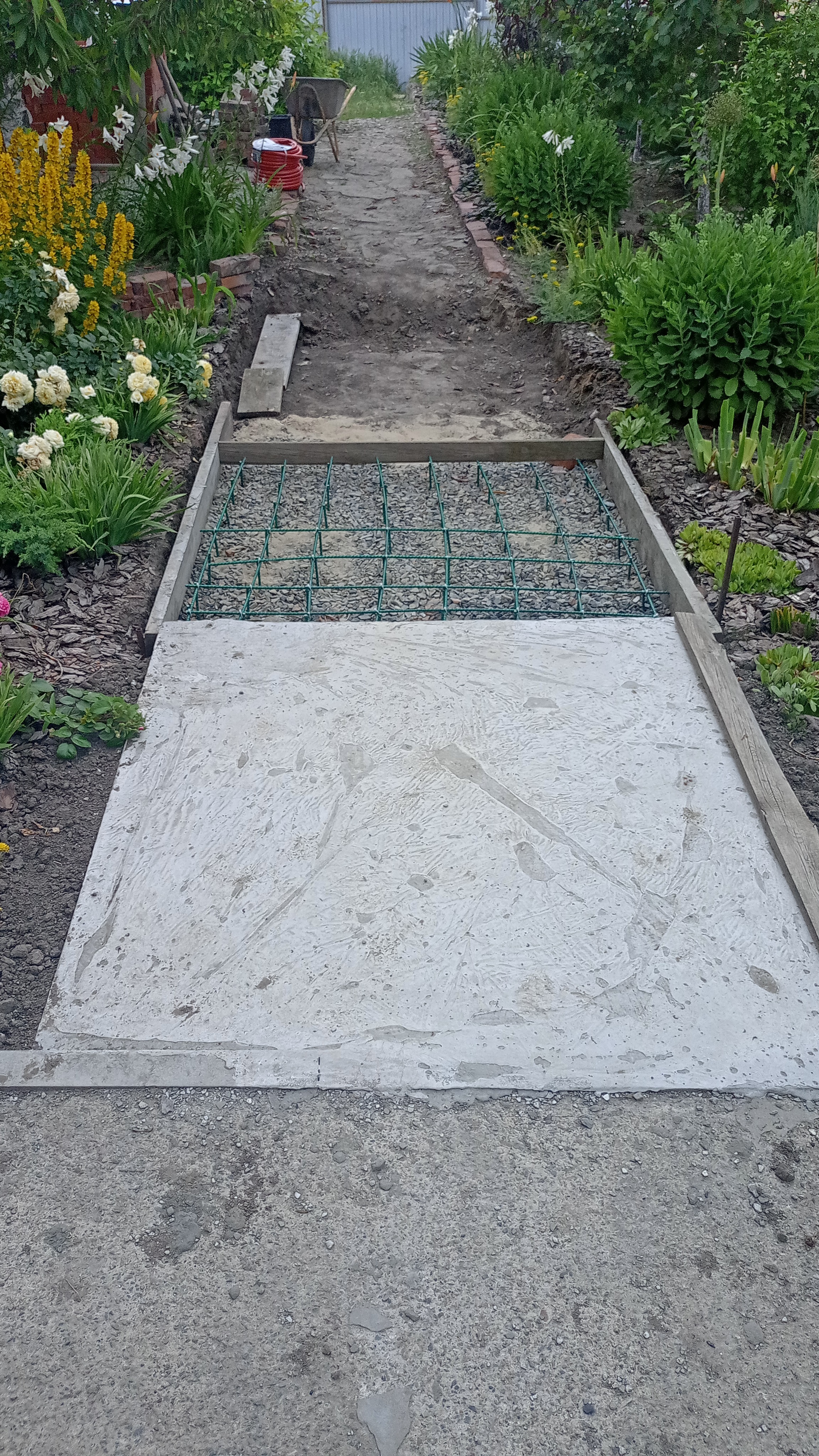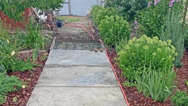 Так как по центральной дорожке нельзя было ходить периодически (цветы высокие, перелазить через них неудобно), то мы параллельно решили залить внутреннюю дорожку — она маленькая, но очень кривая.