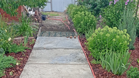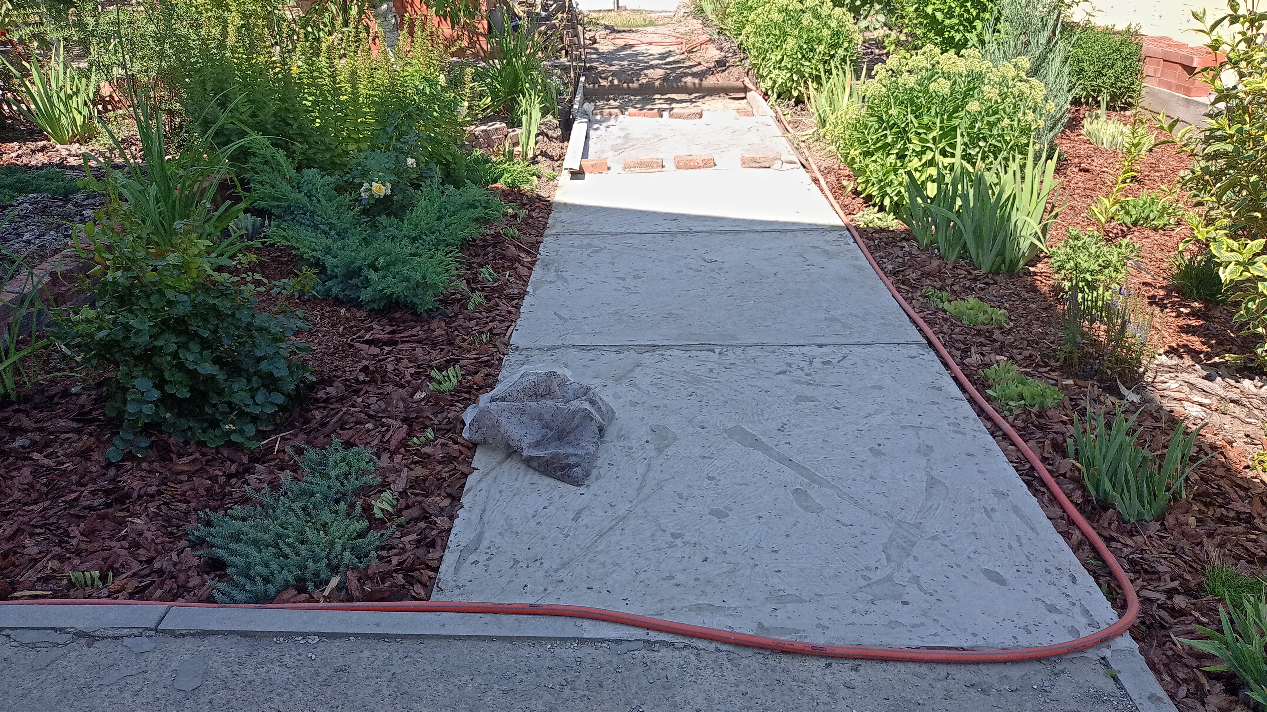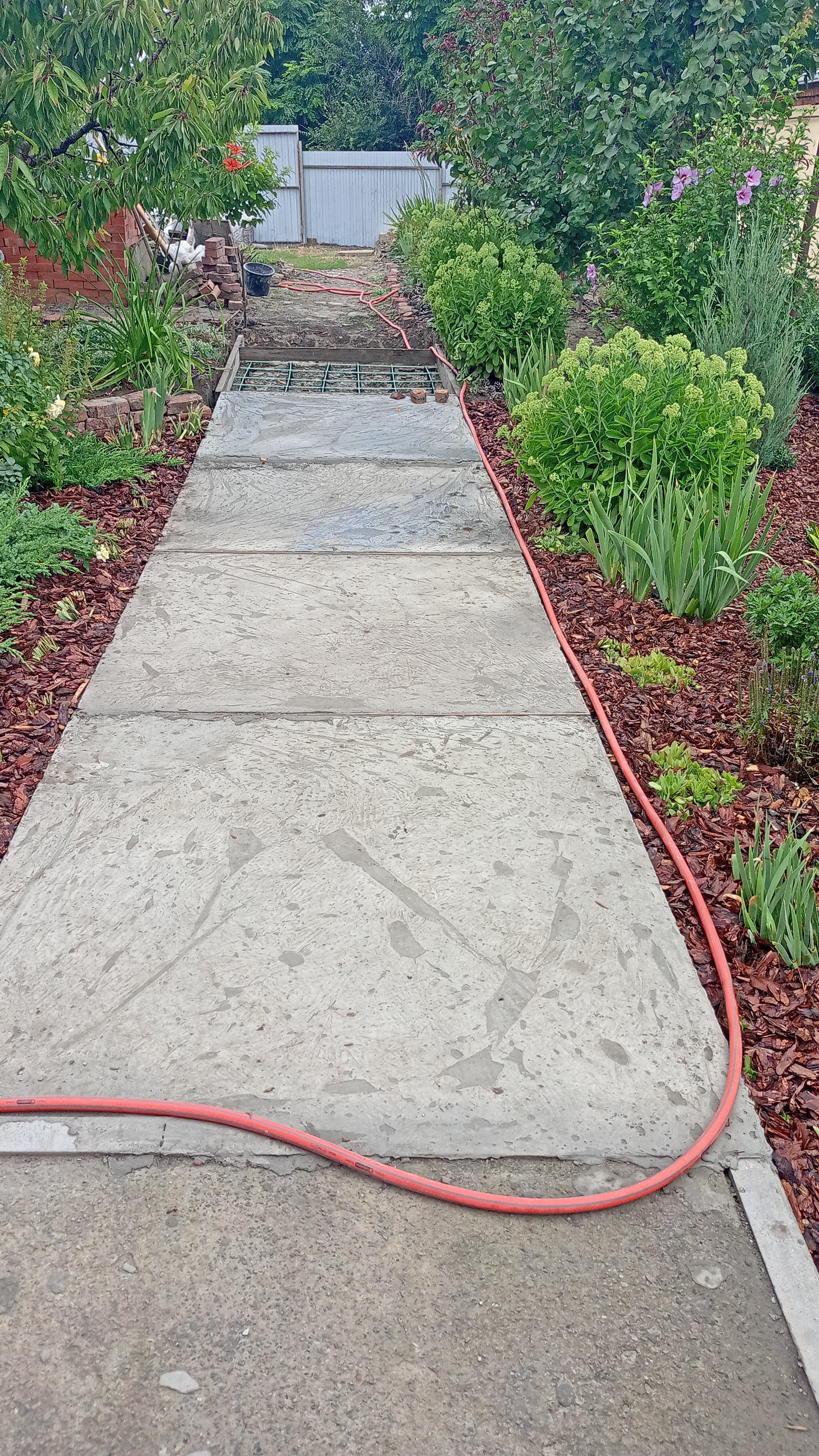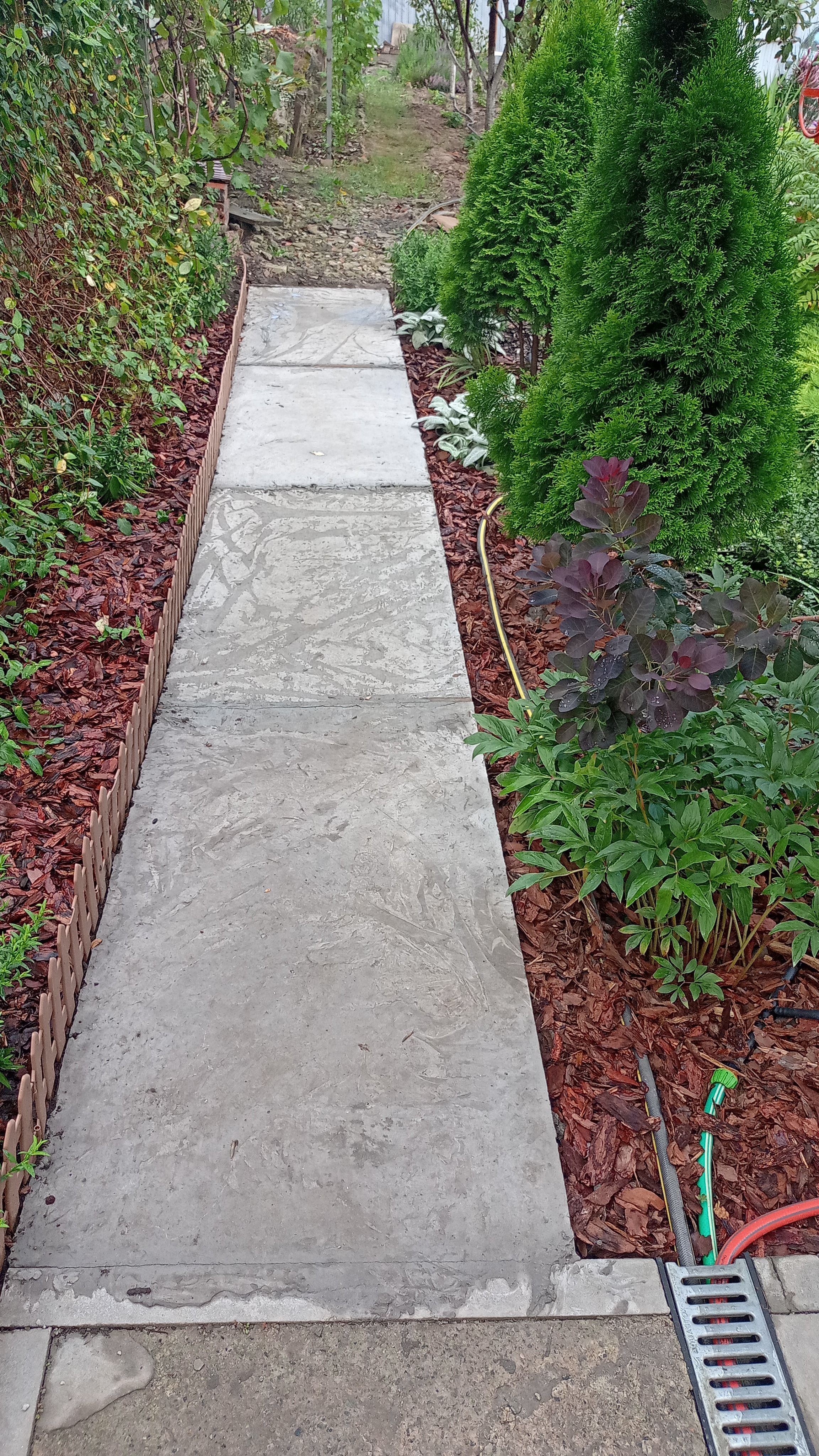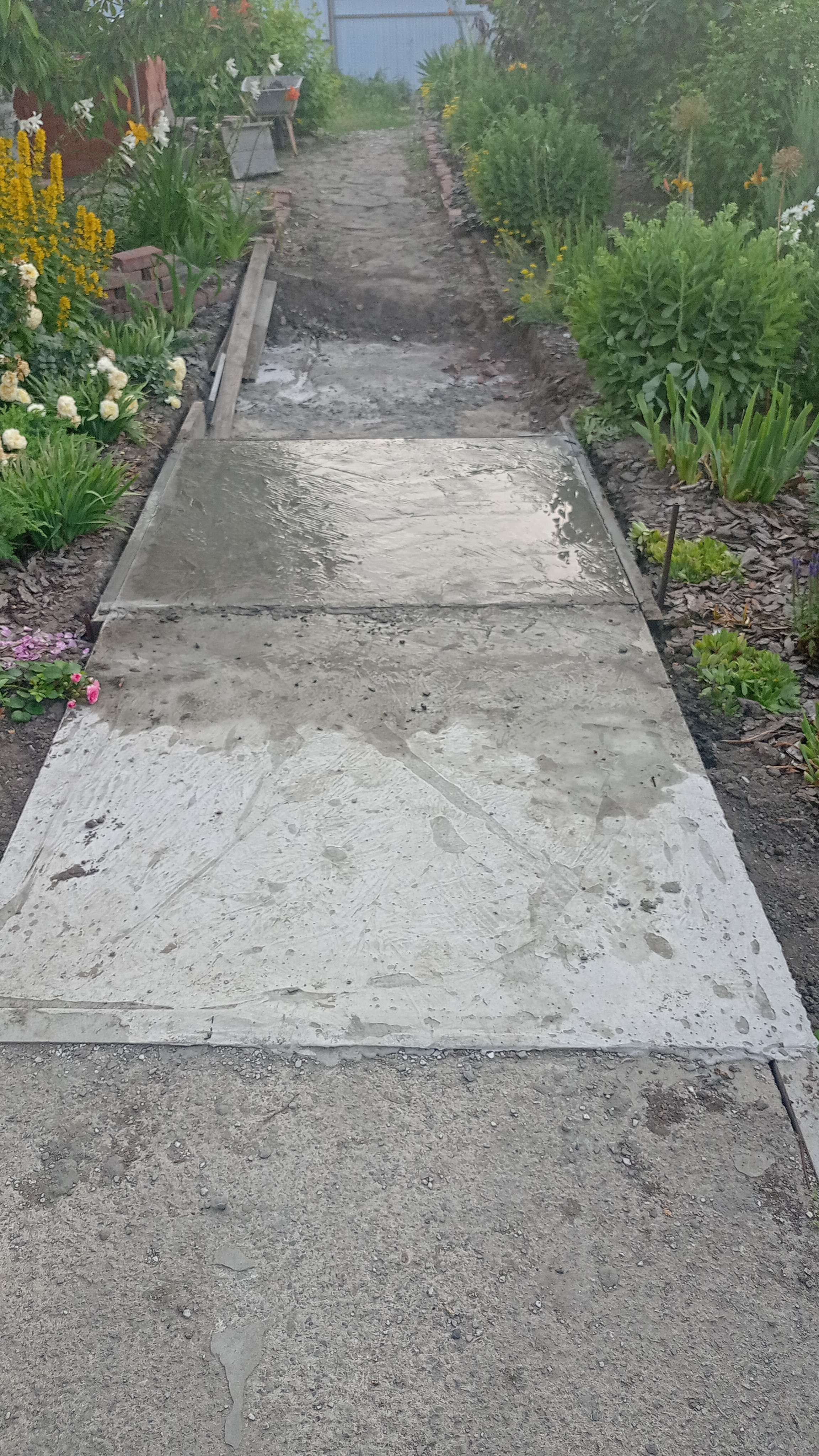 Так как по центральной дорожке нельзя было ходить периодически (цветы высокие, перелазить через них неудобно), то мы параллельно решили залить внутреннюю дорожку — она маленькая, но очень кривая.