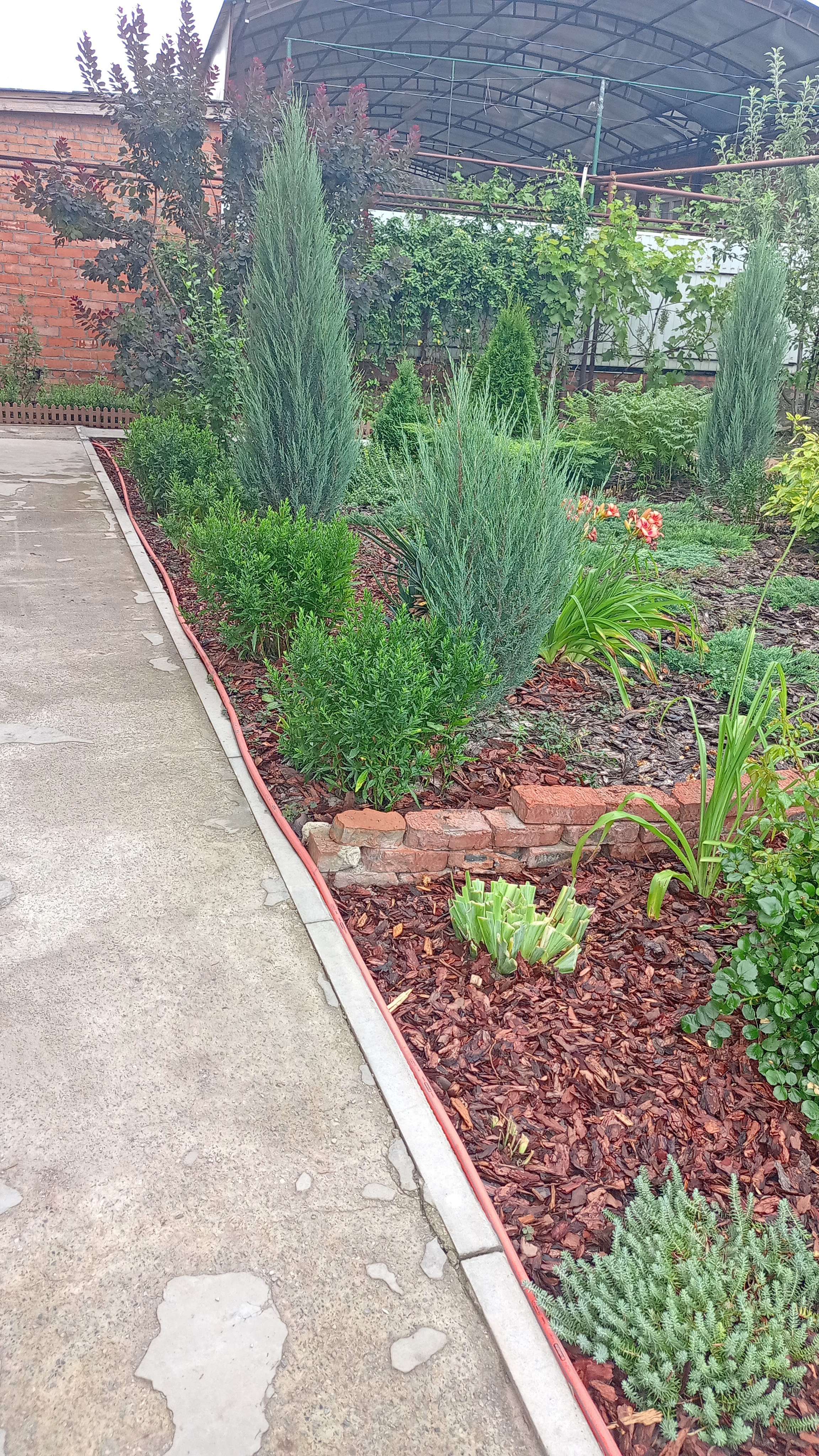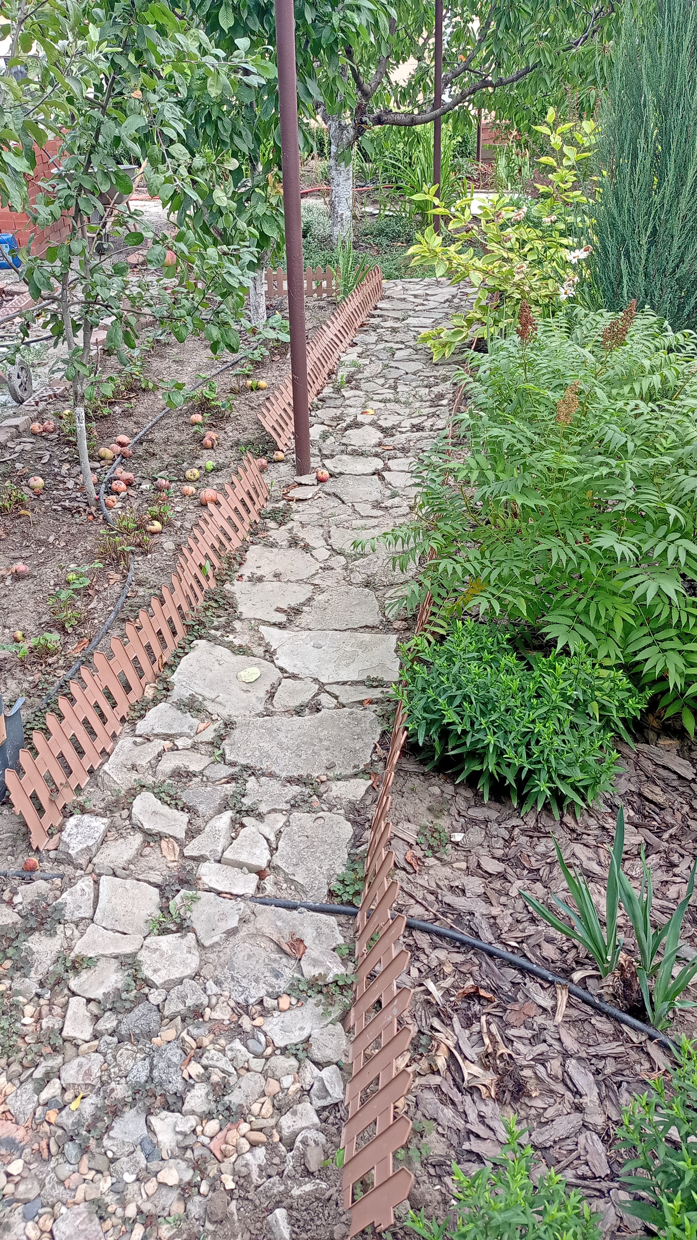 Если смотреть на фото, то левая часть (это верхний недоцветник) у нас выше, чем правая часть (это цветник большой квадратный под окнами кухни). Мульча сползает на дорожку. Кстати, этот пластиковый заборчик у нас уже 2 сезона. И ничего.