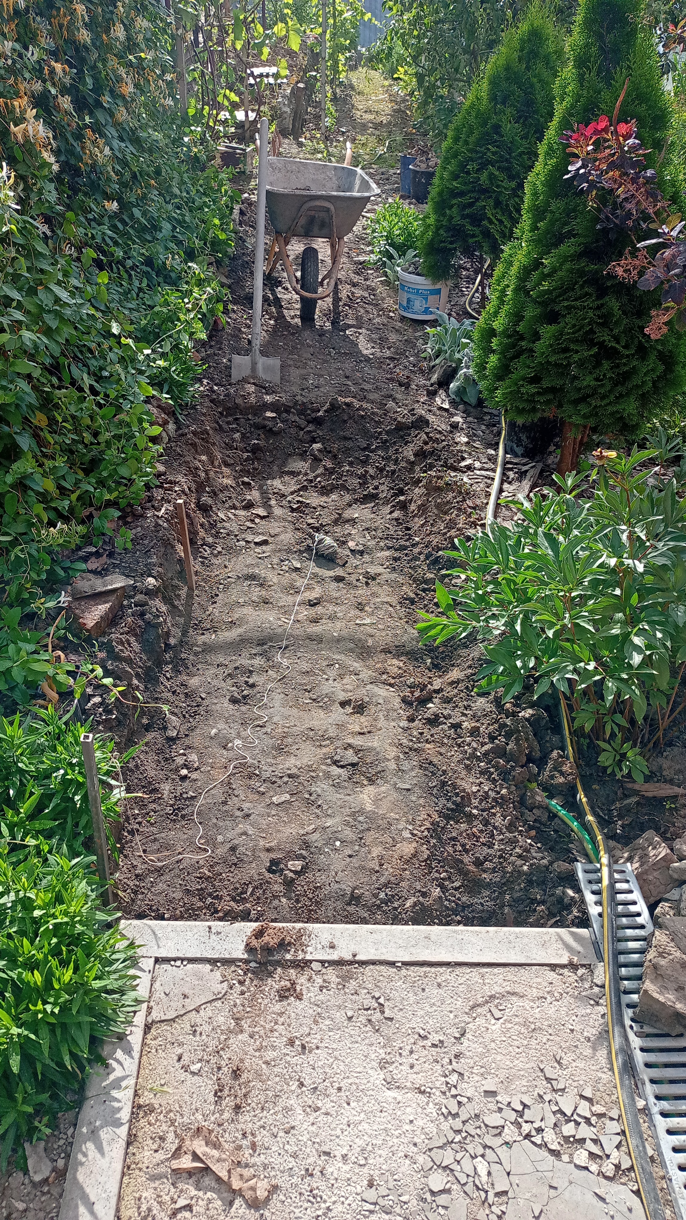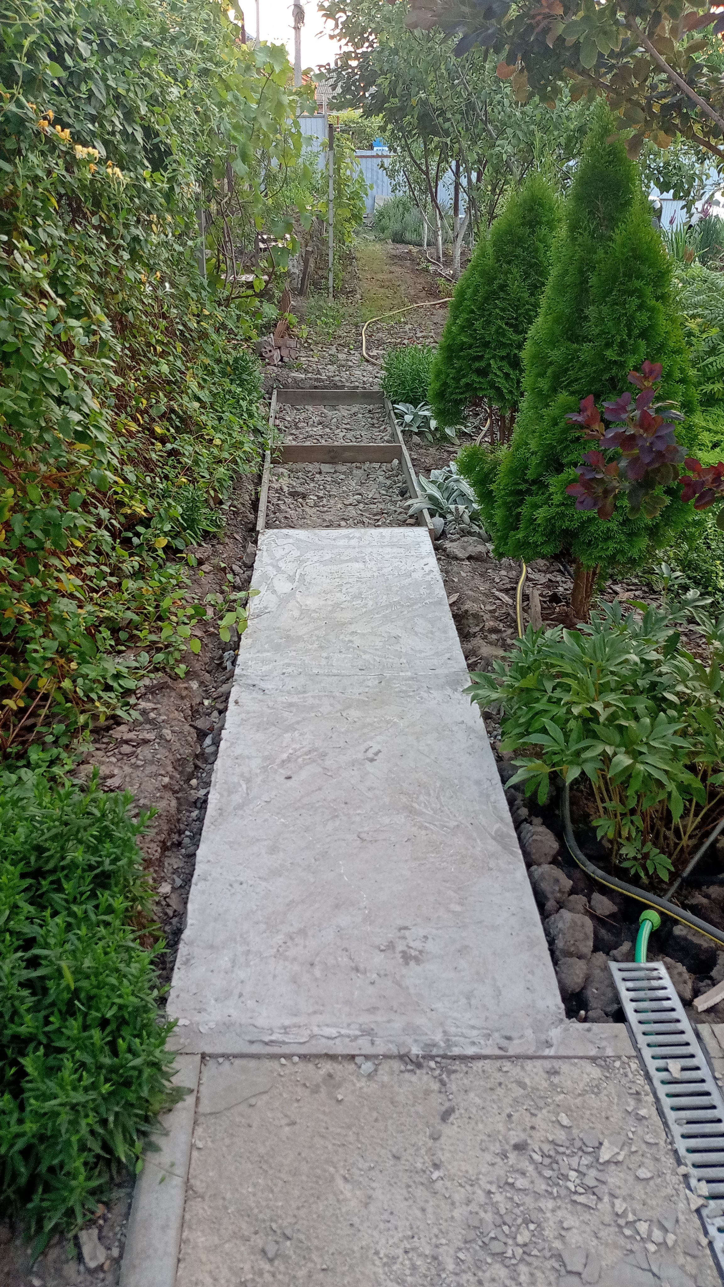 Работы по дорожкам еще много. Все самое интересное, сложное и красивое еще впереди. Но уже начало есть)… Да, и на момент написания поста у нас уже залито 6 секций (но 6 секция пока под укрытием. У нас жара, +40°C). А надо или 10, или 11 секций. Точно пока не знаю, а взять рулетку и измерить остаток дорожки пока лениво… Или некогда… Или я не о том думаю...