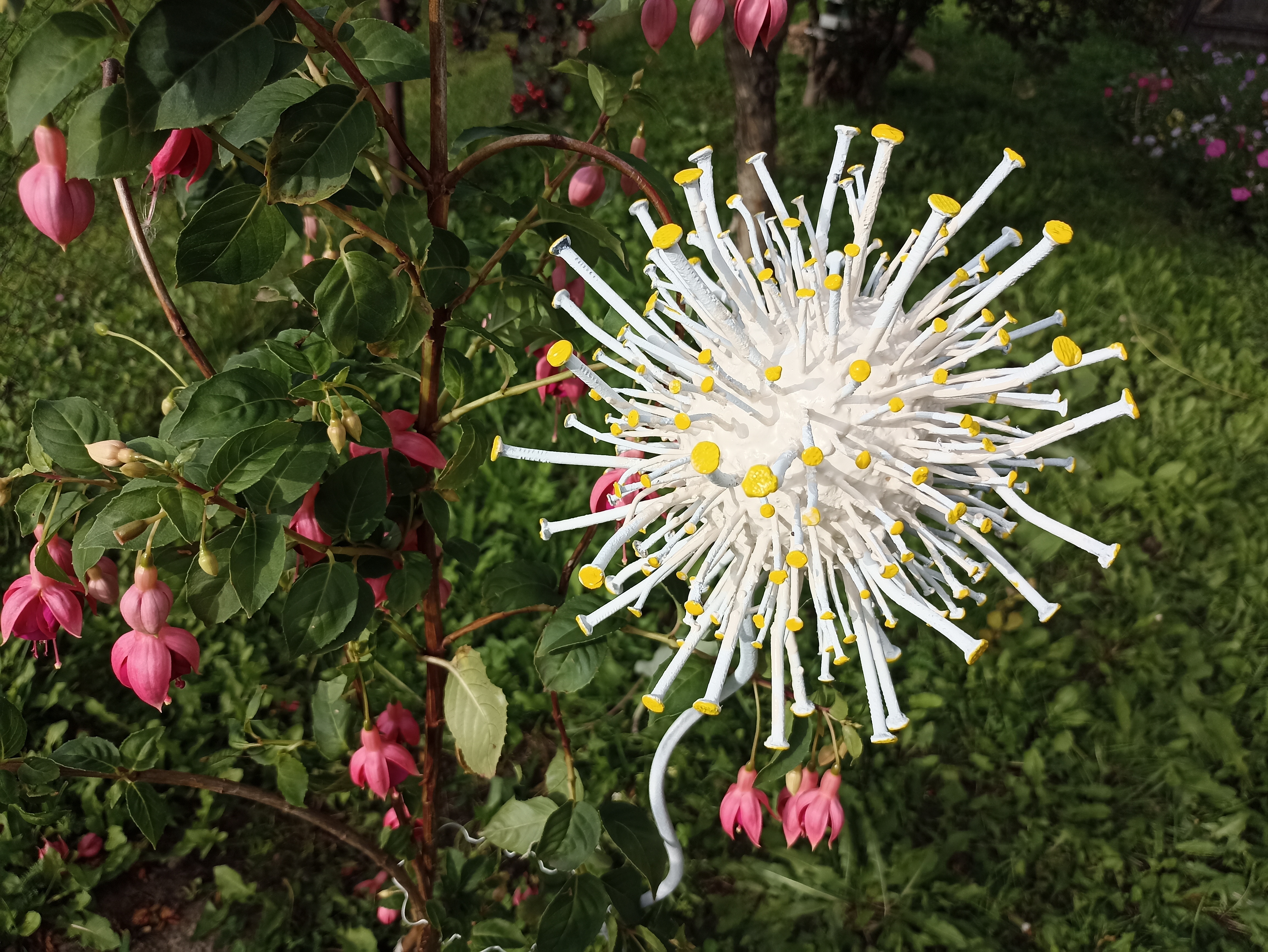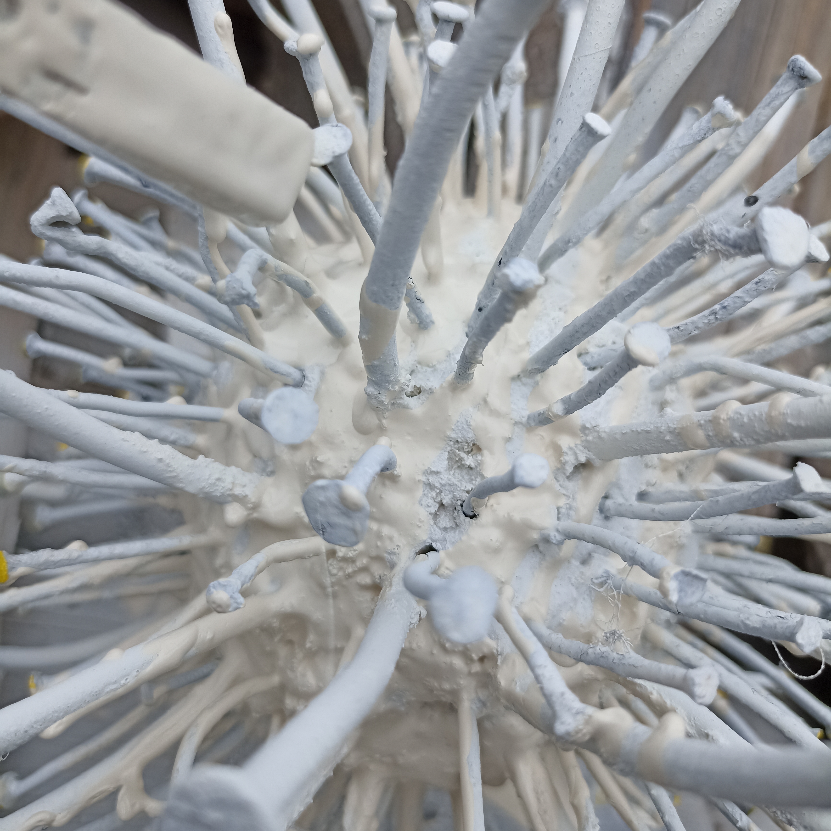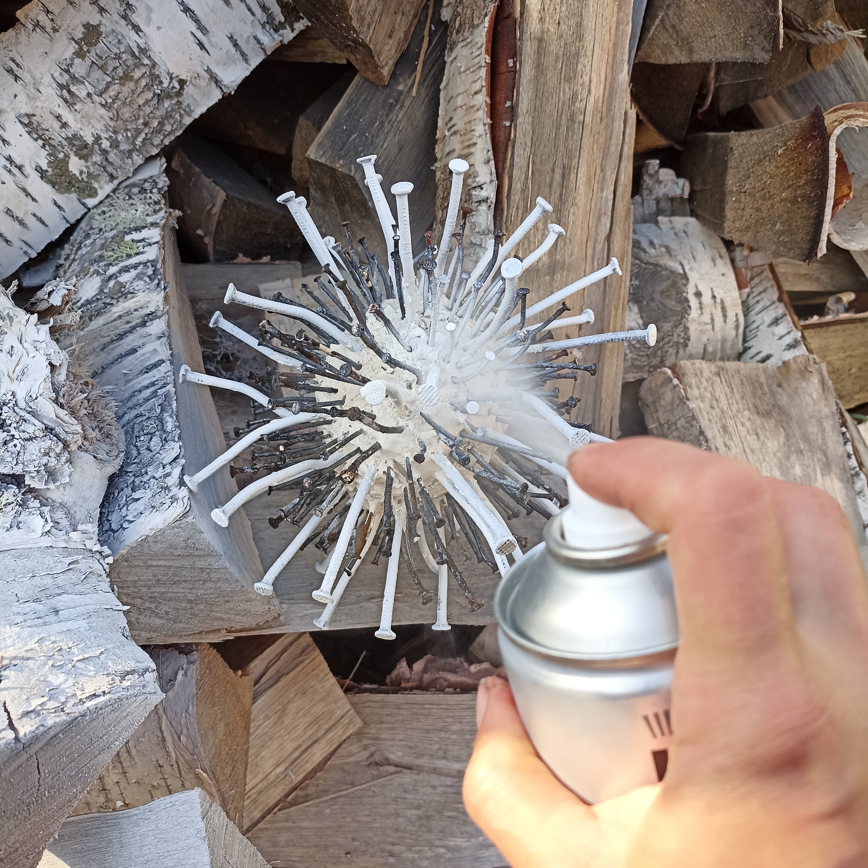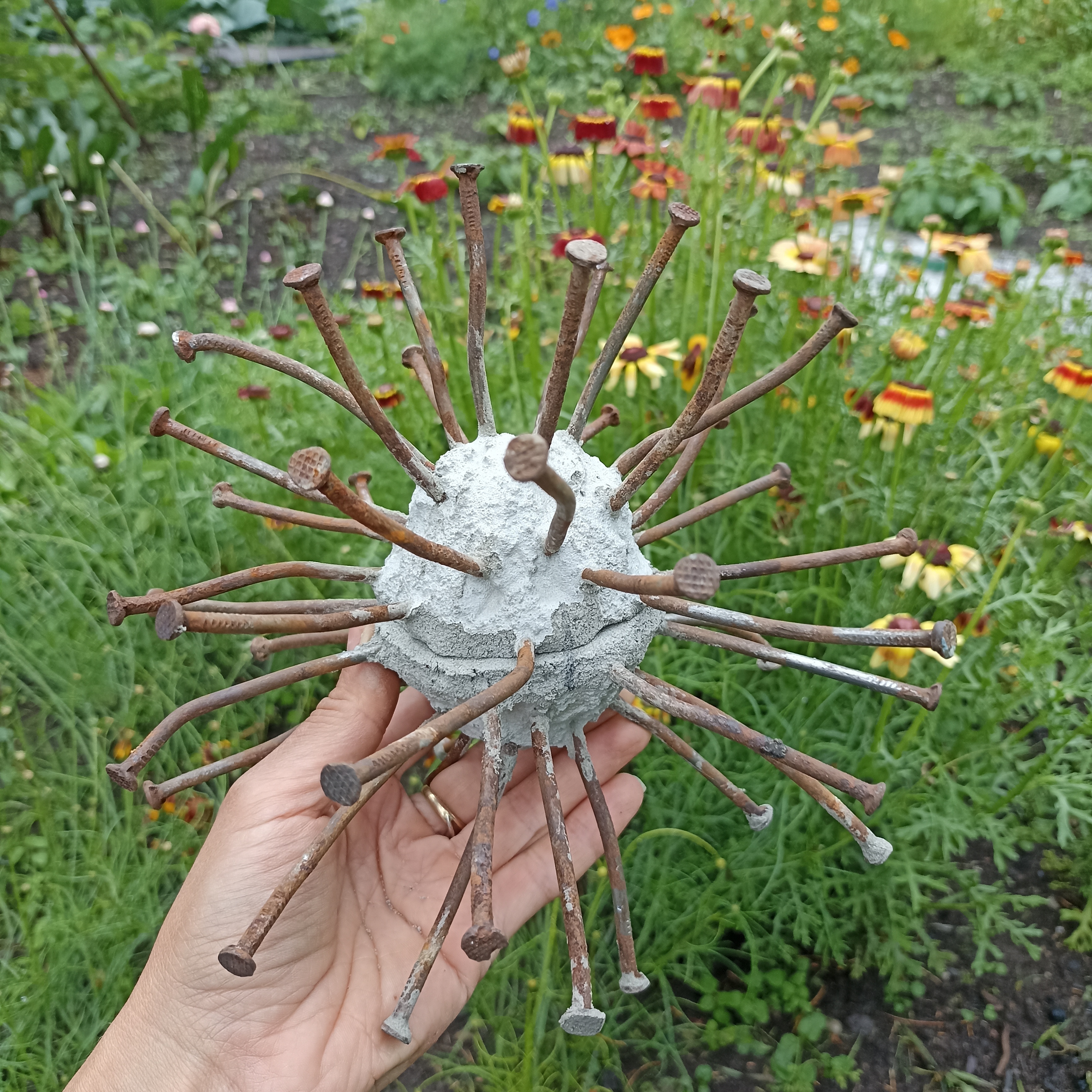 Красила на данном этапе, так как изначально задумывала обклеить бетонный шарик зеркальной мозаикой, но после покраски передумала. «Одуванчик» показался мне уже как после ветра🙂. И я решила добавить ещё гвоздей. Так что при выполнении «цветочка», который получился в итоге, на данном этапе гвозди красить не нужно.