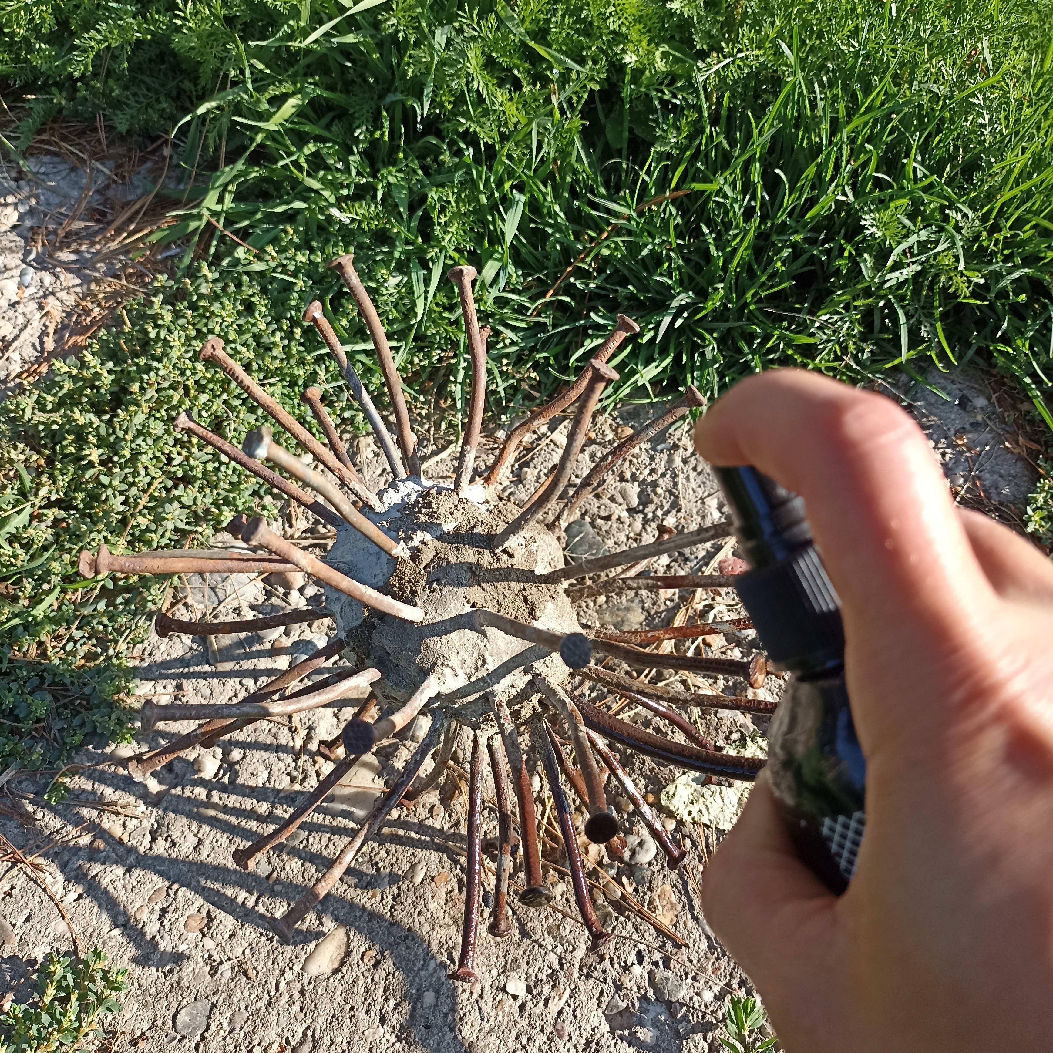 Обмотала бетонную основу вязальной проволокой и нанесла на нее слой белого клея для мозаики. Можно (даже лучше) использовать обычный бетонный раствор. В подсыхающий клей вставляла маленькие гвоздики (тоже лучше использовать б/у или слегка изогнуть, если новые). Готовила раствор маленькими порциями и наносила на цементную основу сегментами, переворачивая шар, только после того как гвозди зафиксировались в застывшем клее.