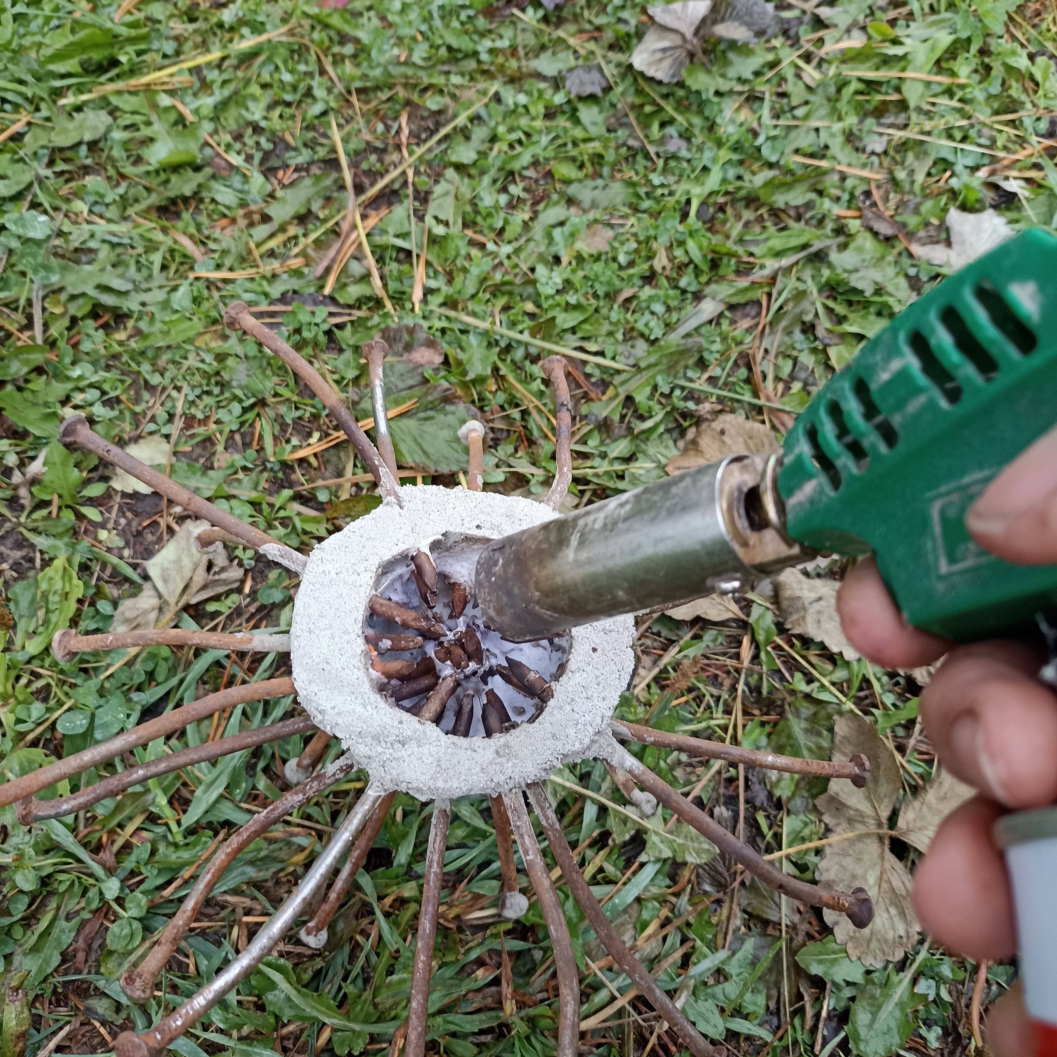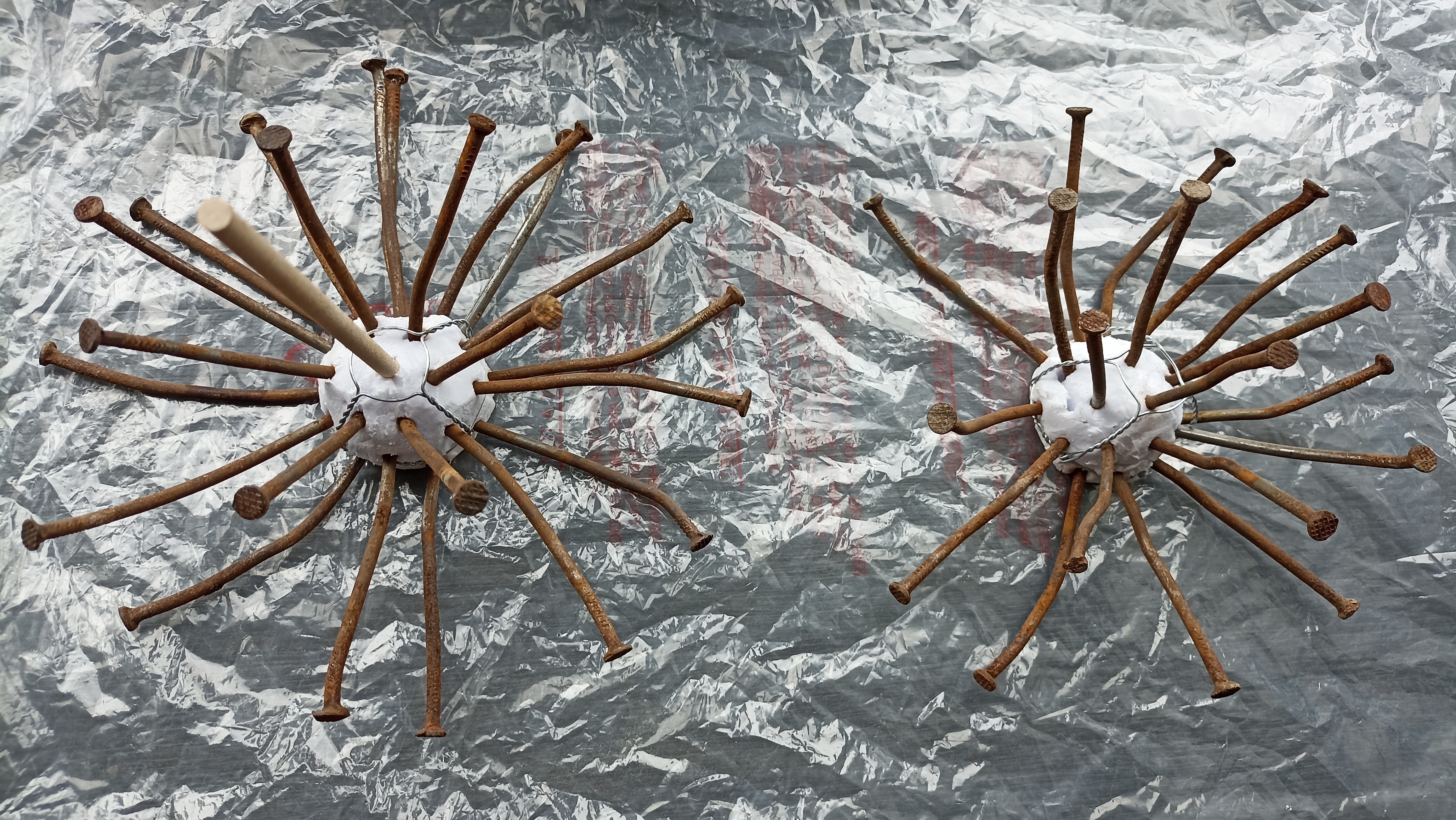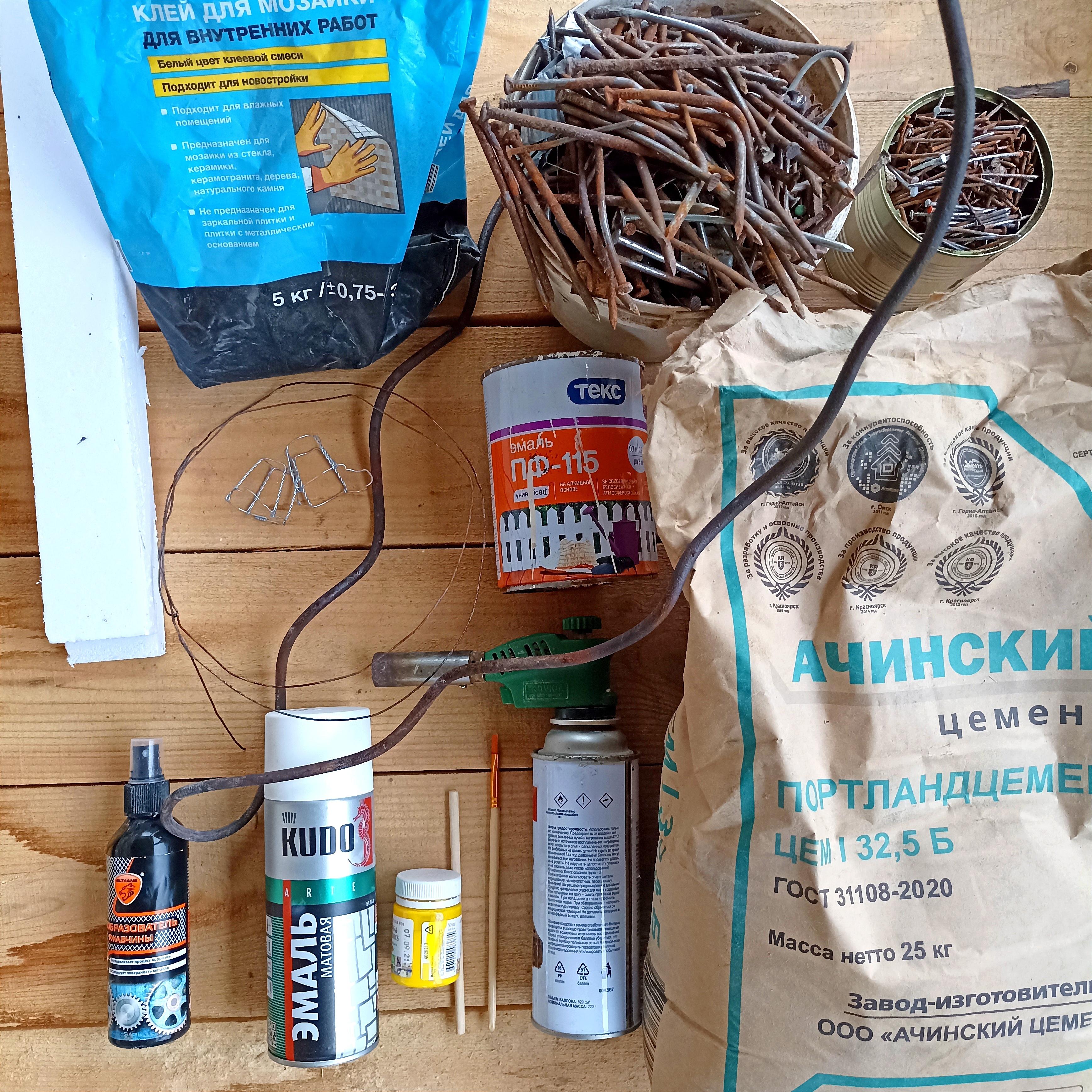 Старые гвозди (лучше б/у)Толстая проволокаВязальная проволокаЦемент + песок + водаБелый клей для мозаики (необязательно)Обрезки пенополистиролаМюзлеКраска белая (эмаль и в баллончике)Краска жёлтаяПреобразователь ржавчины Палочка от мороженого (с круглым сечением)Кусок полиэтиленовой пленки (пакет)КистьГазовая горелка