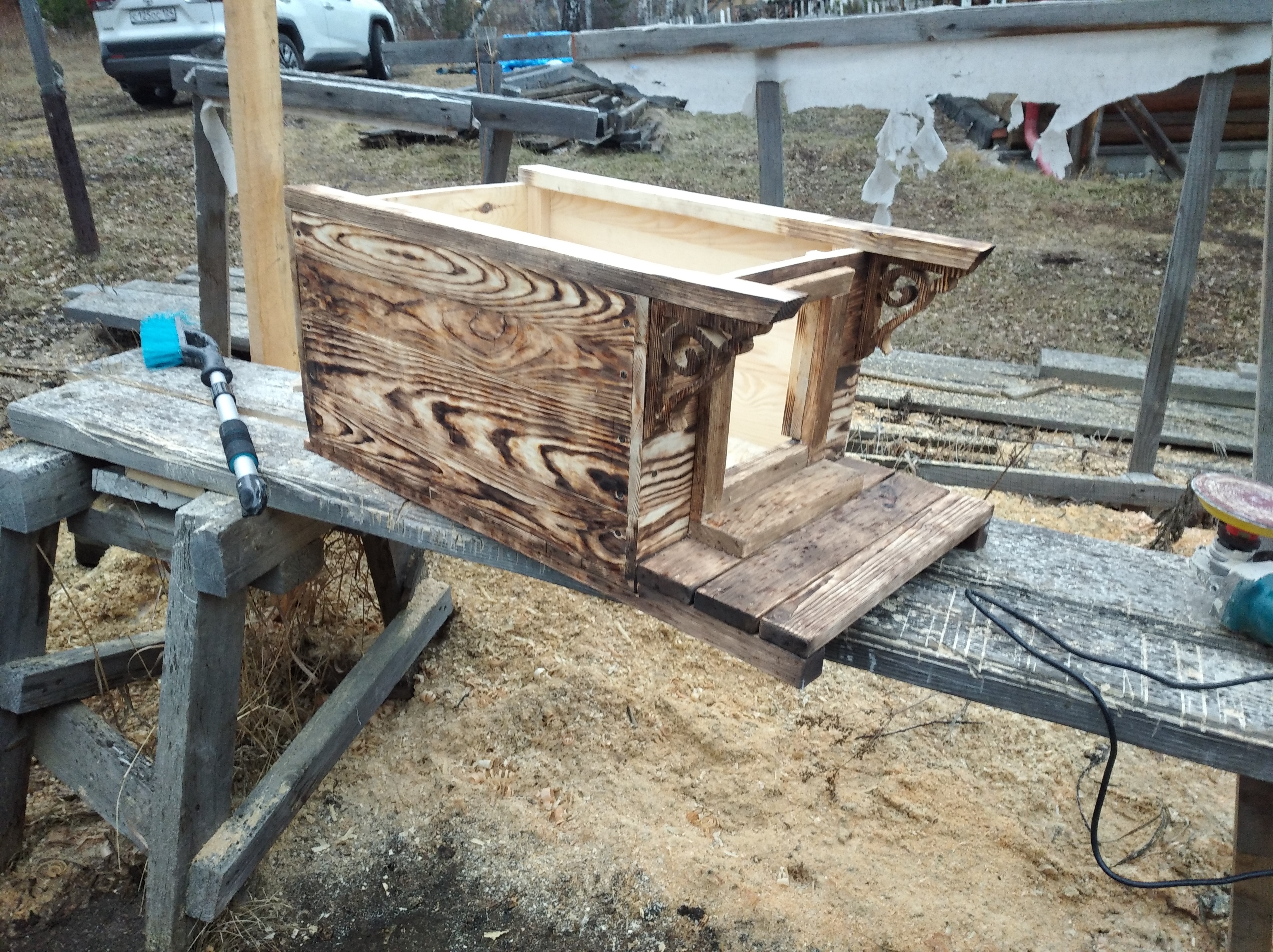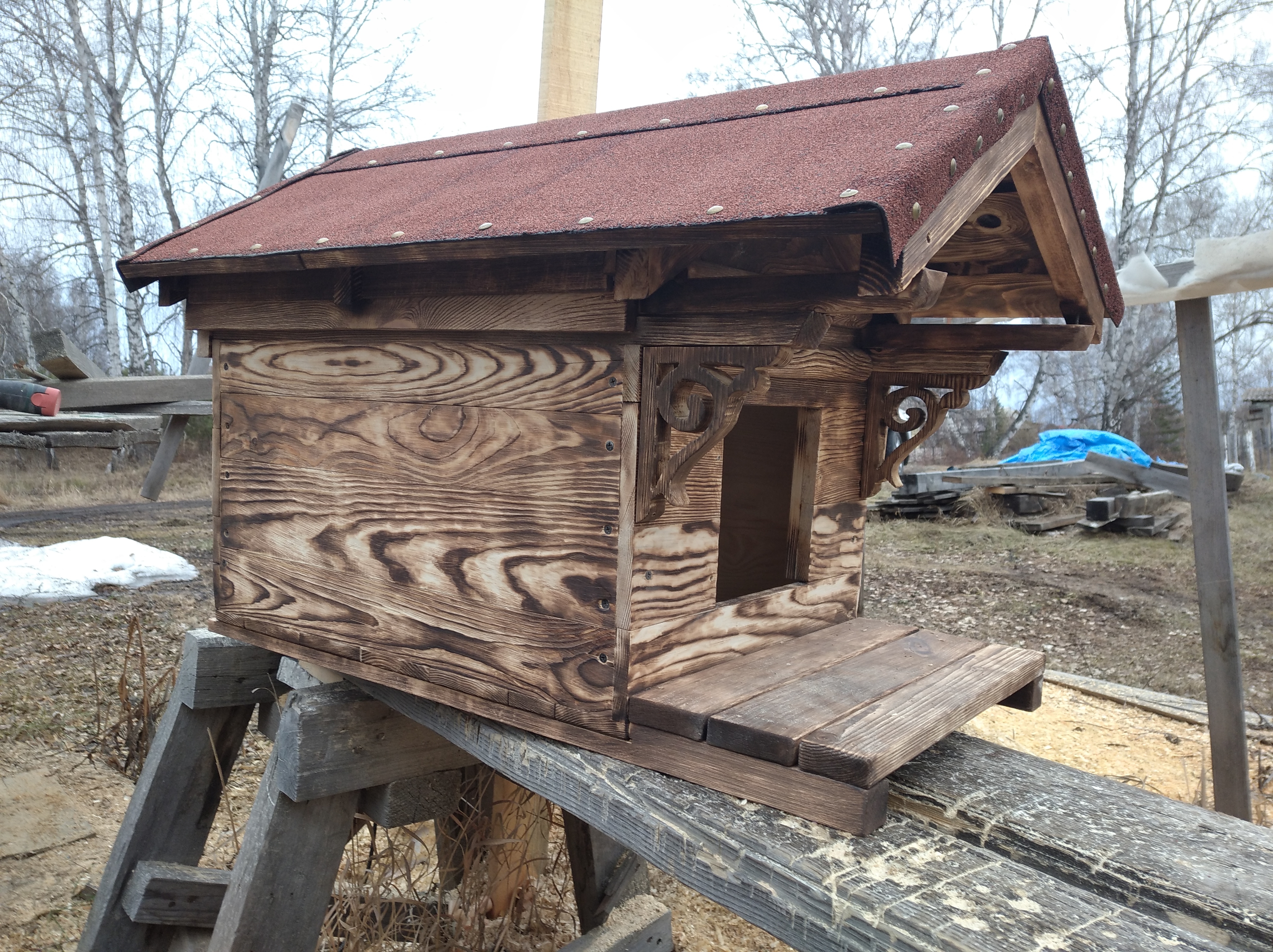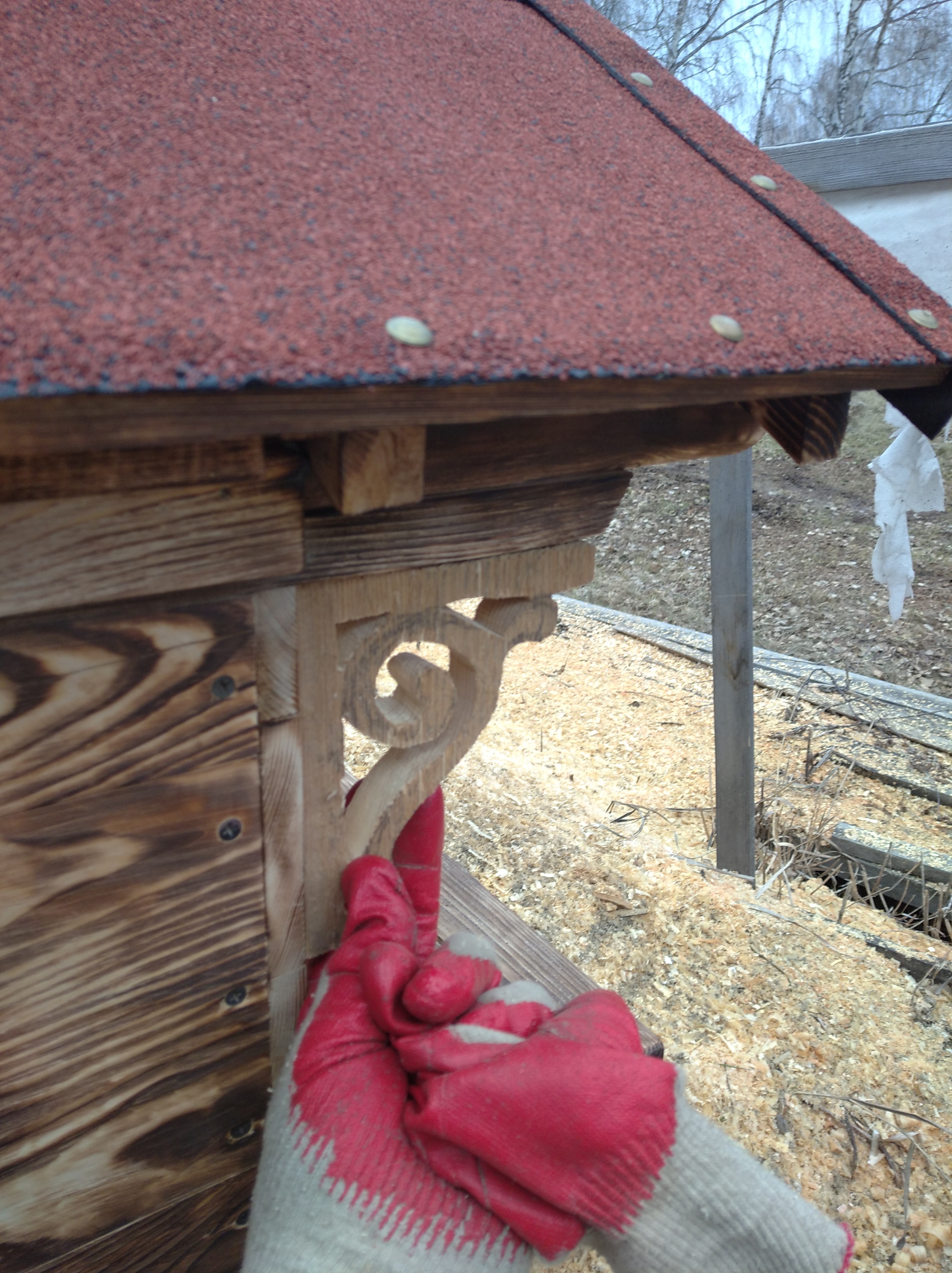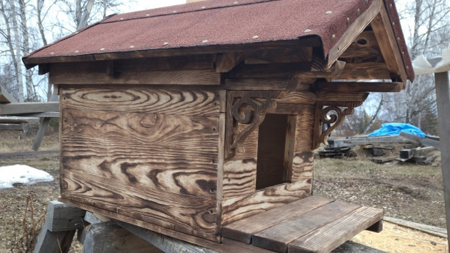 Это тоже не особо помогло в финишном виде. Добавил под выступающую часть крыши декоративный узор, стало чуть лучше. Вид будки всё равно не ушёл. С навесами конструкция усложнилась бы. Поэтому крышу сделал съёмной, внутри легче проводить уборку.