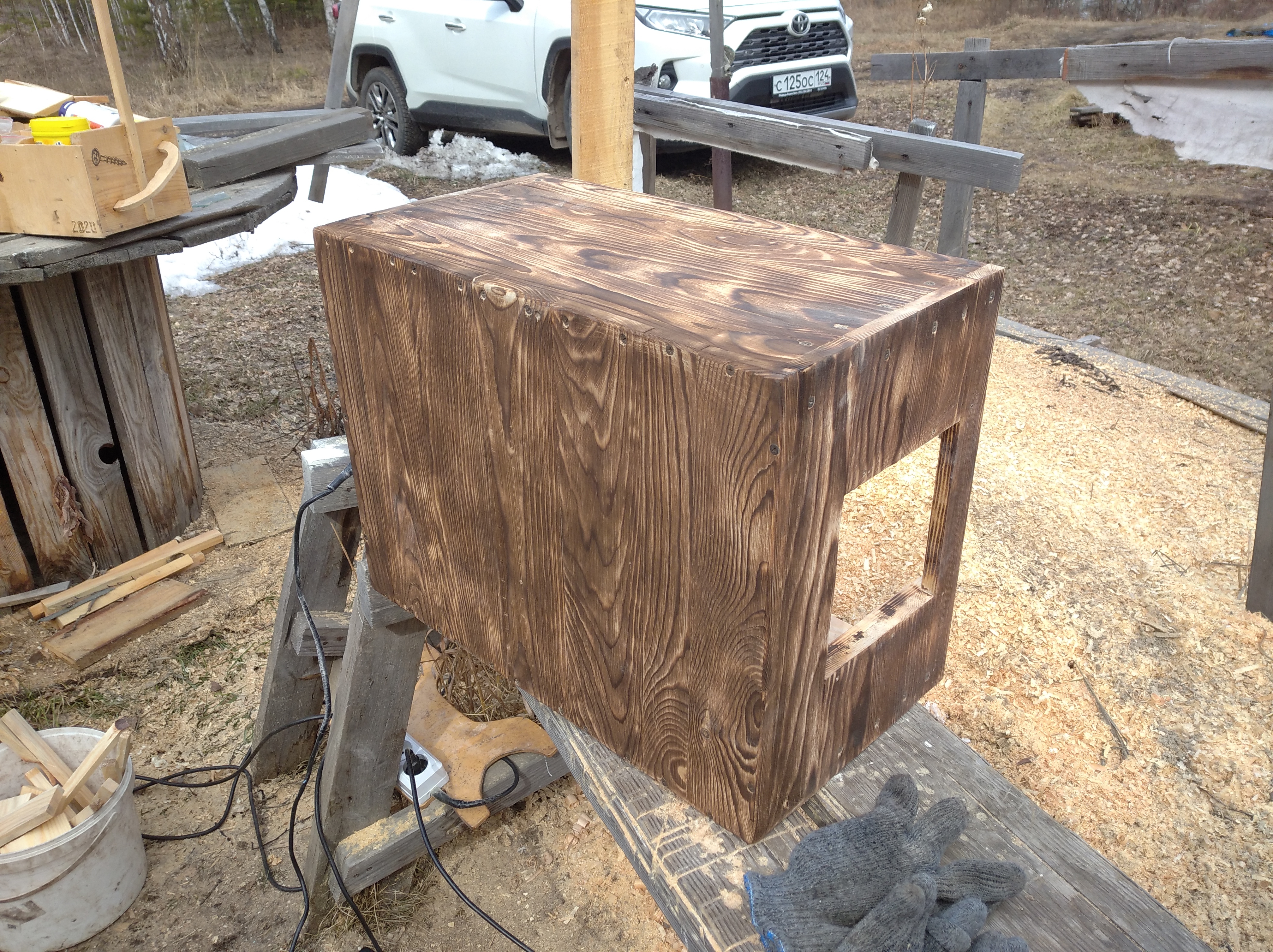 Никак не мог избавится от вида будки. Сделать домик повыше закончились досочки, и вес станет больше. Делать окошко уже не вписывалось в заложенный бюджет и в отведённое время. Пришлось сделать фальш-крылечко и имитацию обналички.