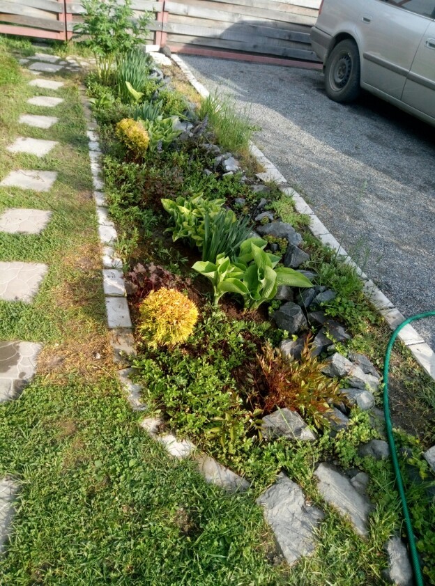 Расцветают нарциссы, проклевываются хосты, у самого входа отрастает пион (это вид цветника со стороны участка, поэтому его можно увидеть вдалеке). Среди камушков уютно расположились молодило и очитки.