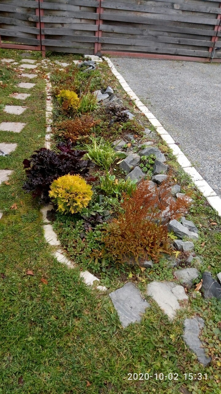 Из растений пока взору предстают две миниатюрные туйки и парочка гейхер, которые впоследствии сменят свои зимние листочки на новые. Да еще радует глаз своими цветочками-звездочками хинодокса, которая «разбрелась» по всему участку (как она это сделала, для меня до сих пор загадка).