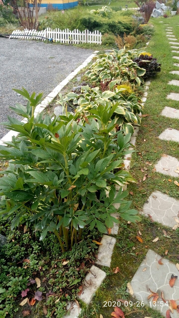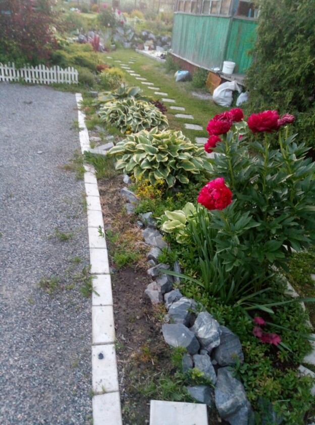 . Цветет пион, хосты вошли в полную силу. Гейхеры сменили листья на новые. Листья отцветших нарциссов еще пока зеленые.