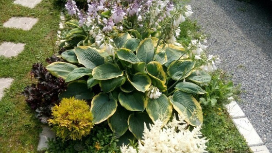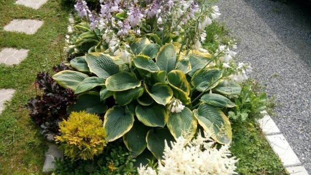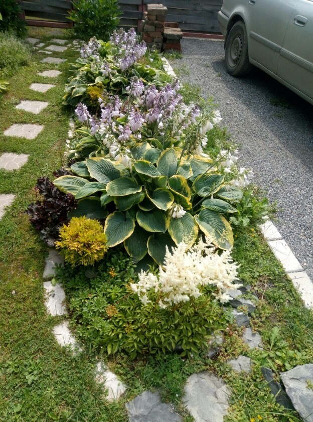 Десять дней спустя. Отцвел пион, но зацветают астильба Вайс Глория, хоста, очиток едкий (на переднем плане видны его желтые соцветия).