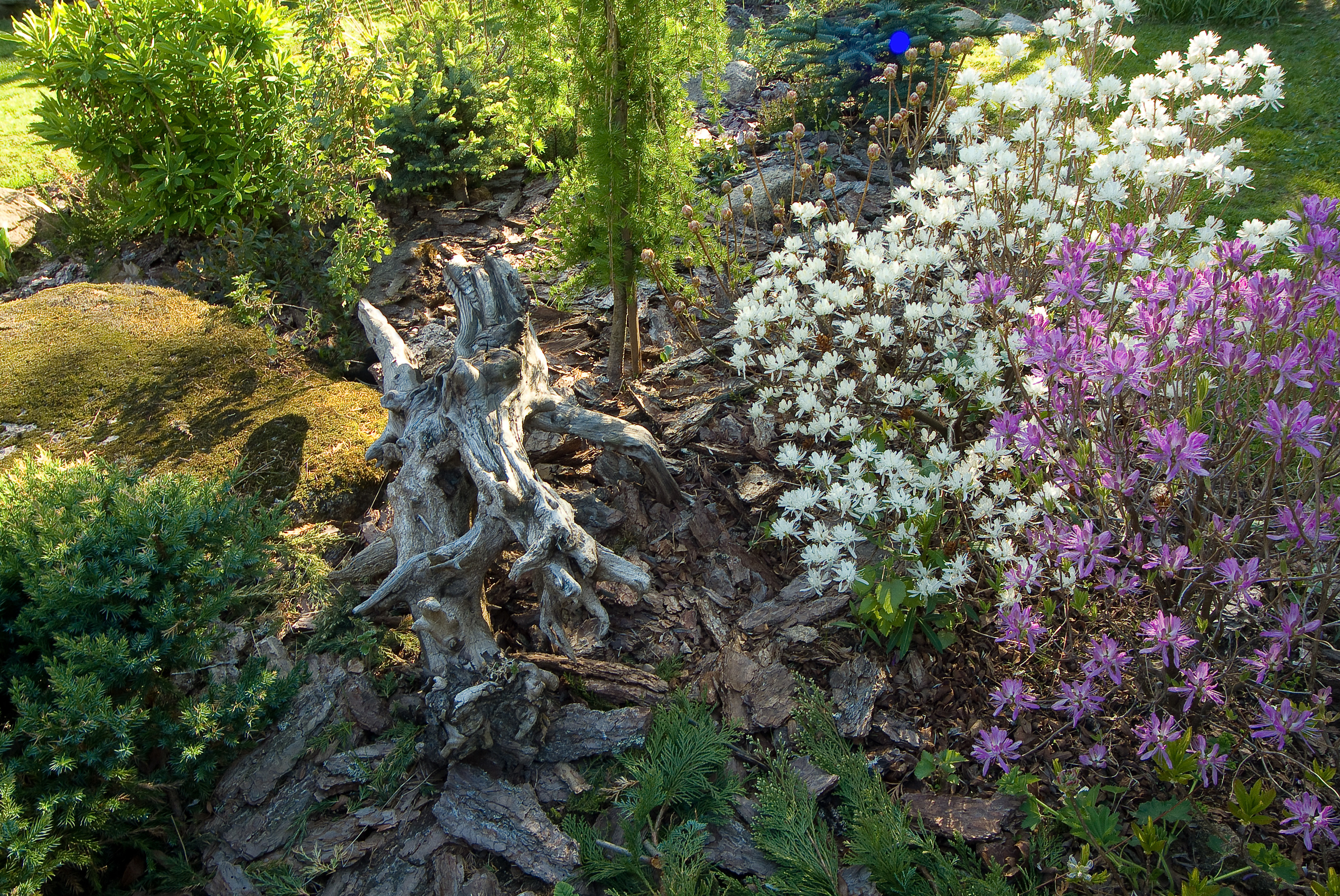 Владельцам участков с уже растущими крупными хвойными следует обратить внимание на лесные пейзажи, в особенности на такие, где деревья растут сравнительно редко и под ними образуется достаточно освещенная подстилка, пригодная для роста кустарников. Наиболее живописно выглядят такие уголки в горах на границе лесного пояса. В подобной местности хорошо сочетается графика стволов деревьев и крупные валуны, негустая растительность – вечнозеленые рододендроны, небольшие ажурные кустарники.