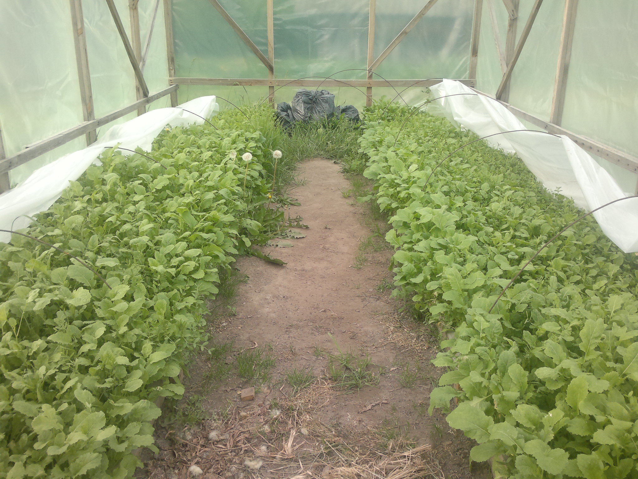 Срезали зеленую массу и решили пролить ее ЭМками, да и укрыть обратно все той же пленкой. Хотя толку, по моему, не было ни от пленки, ни от ЭМок — холодновато все равно). И 17-18 мая не спеша, с чувством, с толком рассаду высадили. Для подстраховки заново понатыкали проволоку и накинули пленку.