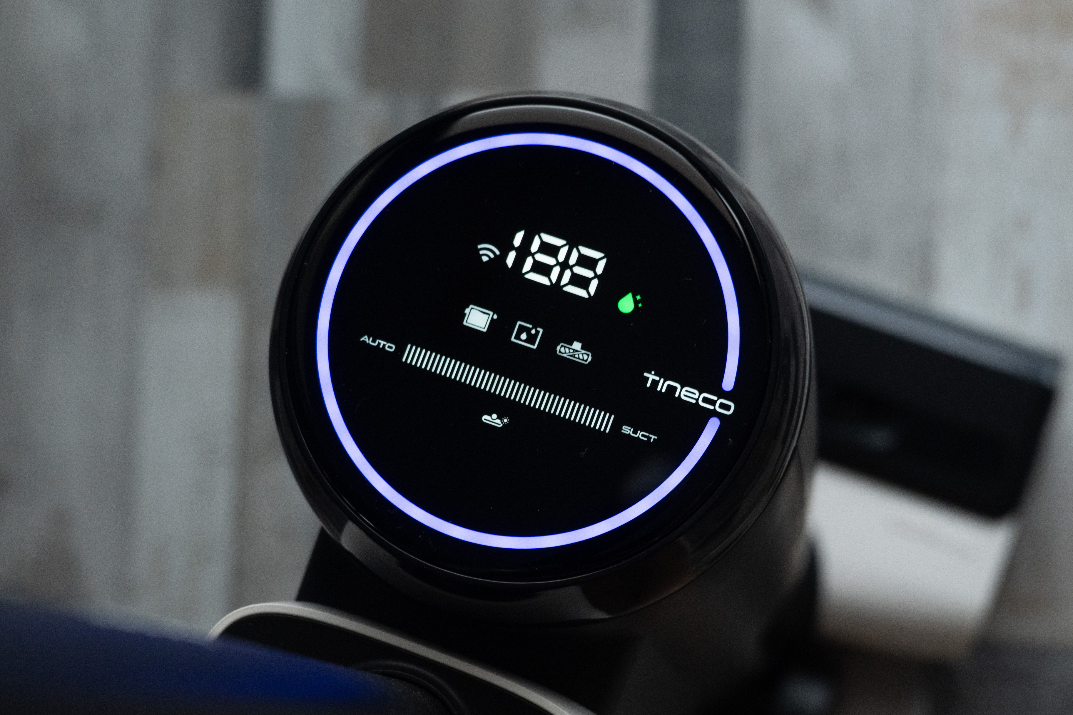 Зато у него есть большой и яркий LED-дисплей, который в реальном времени показывает степень загрязнения пола. Если пылесос въезжает в область пола с сильным загрязнением, загорается красное кольцо. Оно же может и посинеть, когда поверхность станет чище в результате ваших с пылесосом манипуляций.