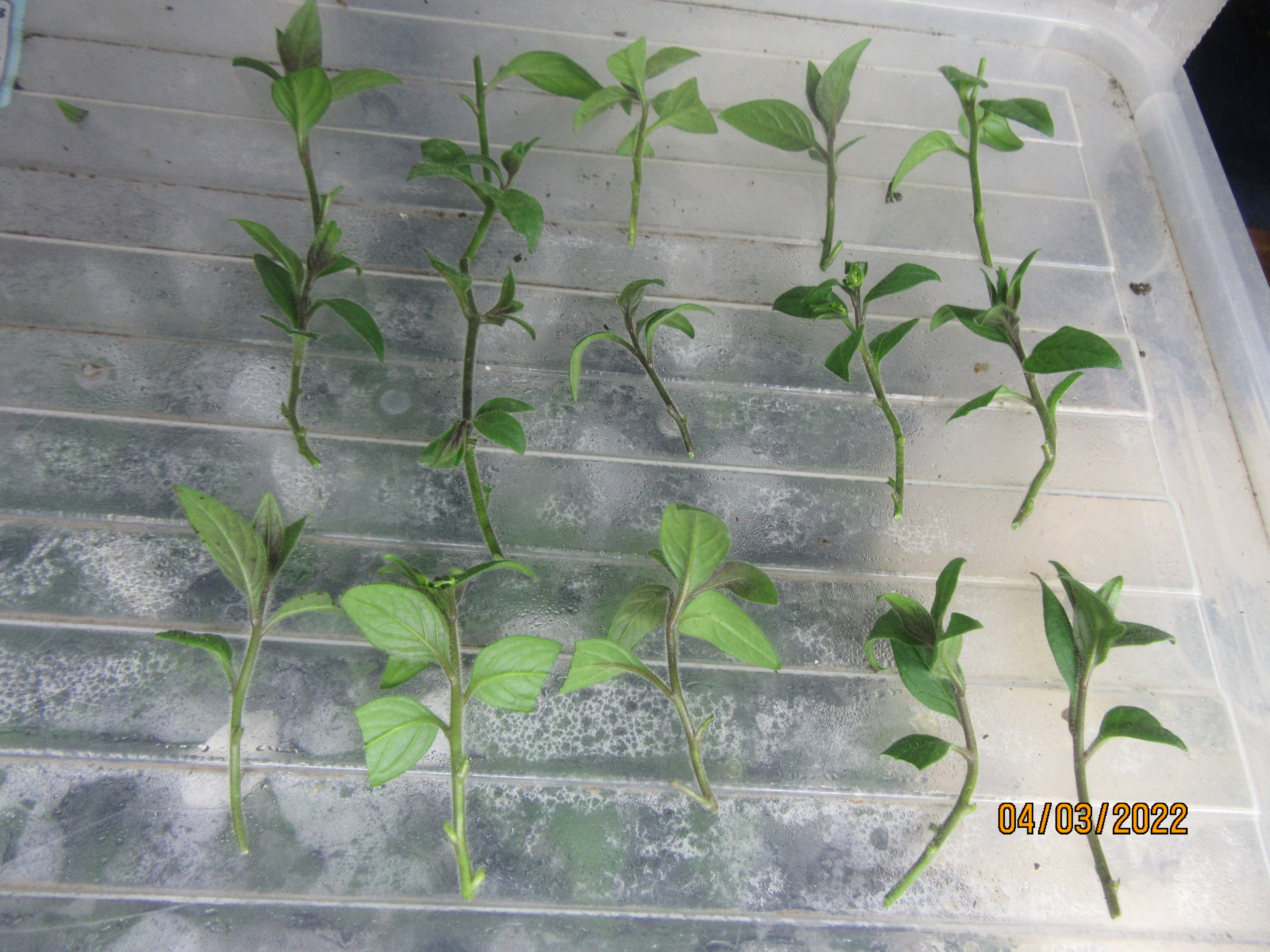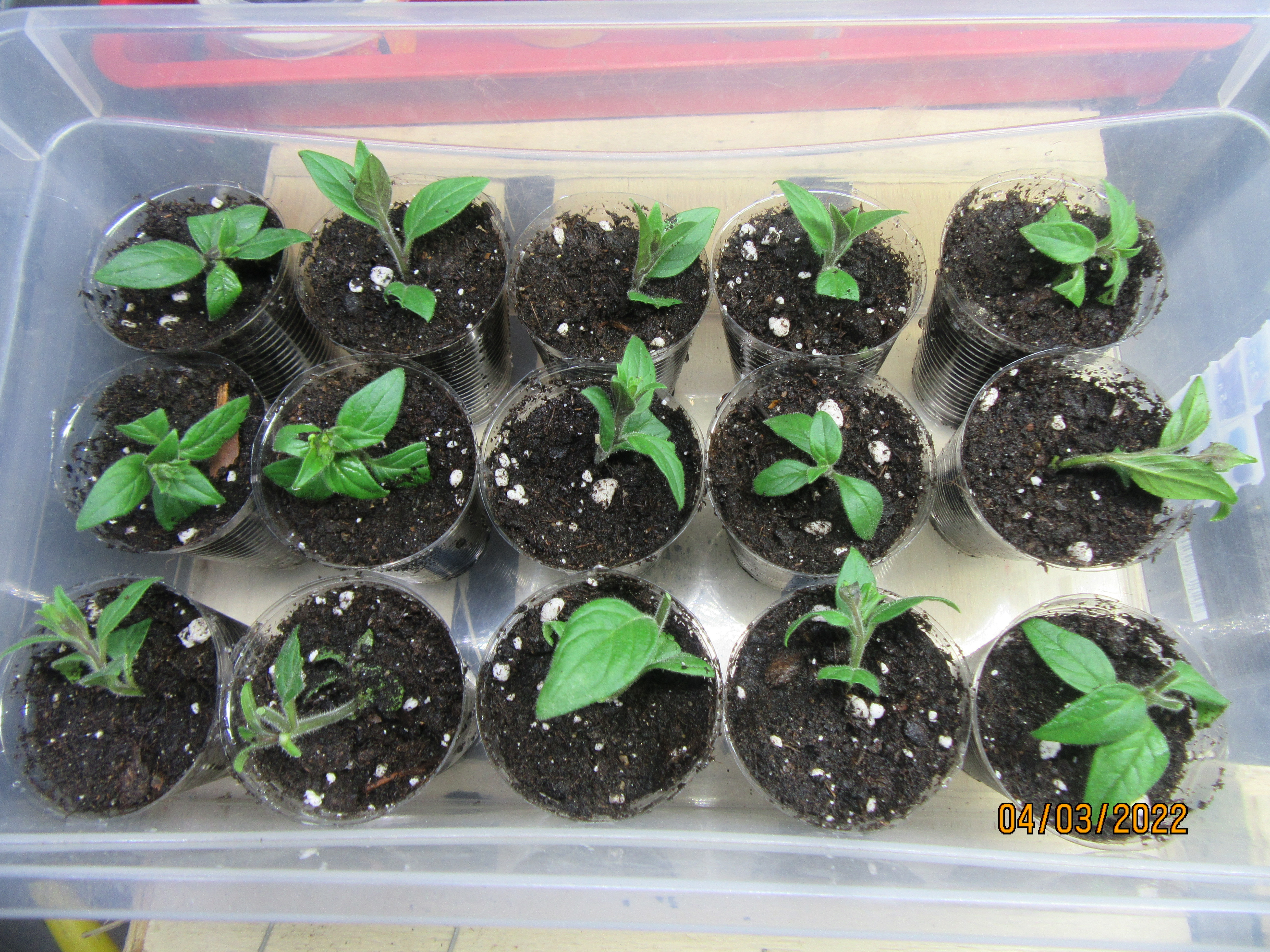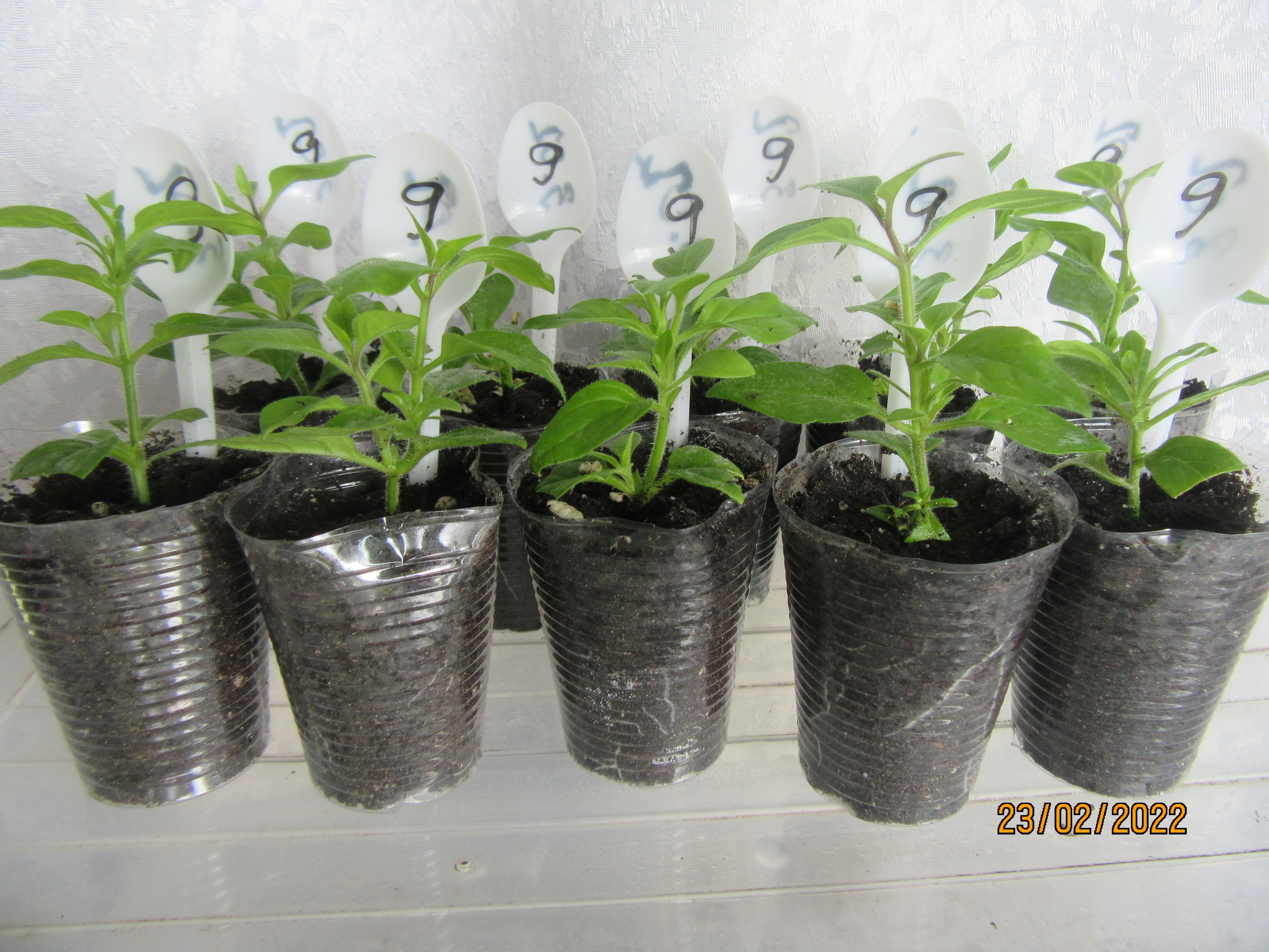 Дней через пять или больше (при ежедневном проветривании один раз в день и хорошей подсветке) семечко прорастет, прозрачный стаканчик можно убрать. Когда куст петунии вырастет побольше, можно первый раз срезать черенки. Черенкую в 100 мл одноразовые стаканчики с отверстиями на дне, для черенкования беру грунт «Терра-вита». В «Корневин» черенки можно «макать», можно без «Корневина» — разницы никакой. Черенки ставят в любую прозрачную емкость (отличные и недорогие прозрачные ящике продаются в Fix Price), через две-три недели, как нарастет приличная корневая система, черенки рассаживают в большие емкости. После отрастания побегов на маточном растении и на черенках с первой партии их тоже при необходимости срезают и черенкуют. Далее все даты указаны на фото.