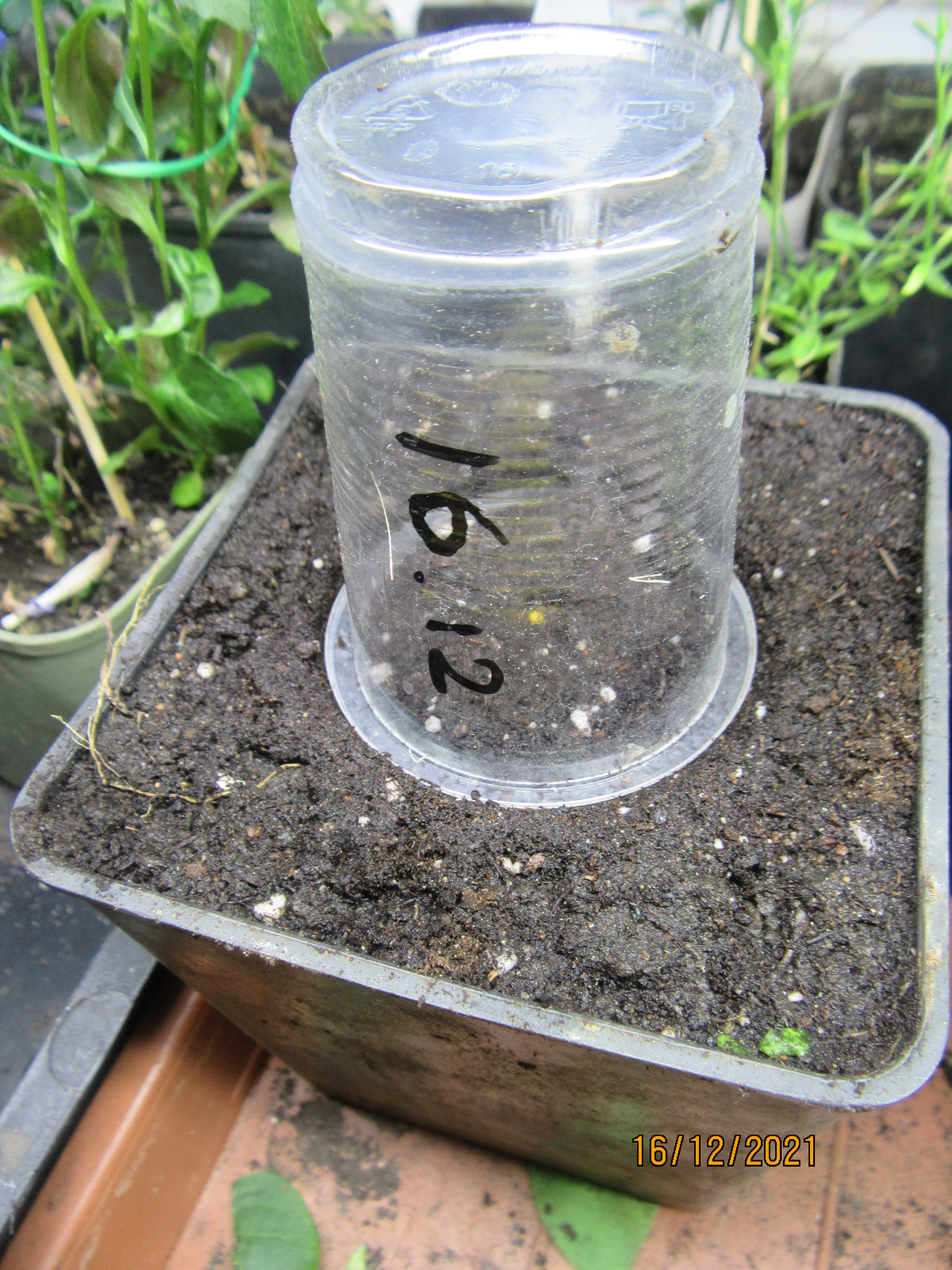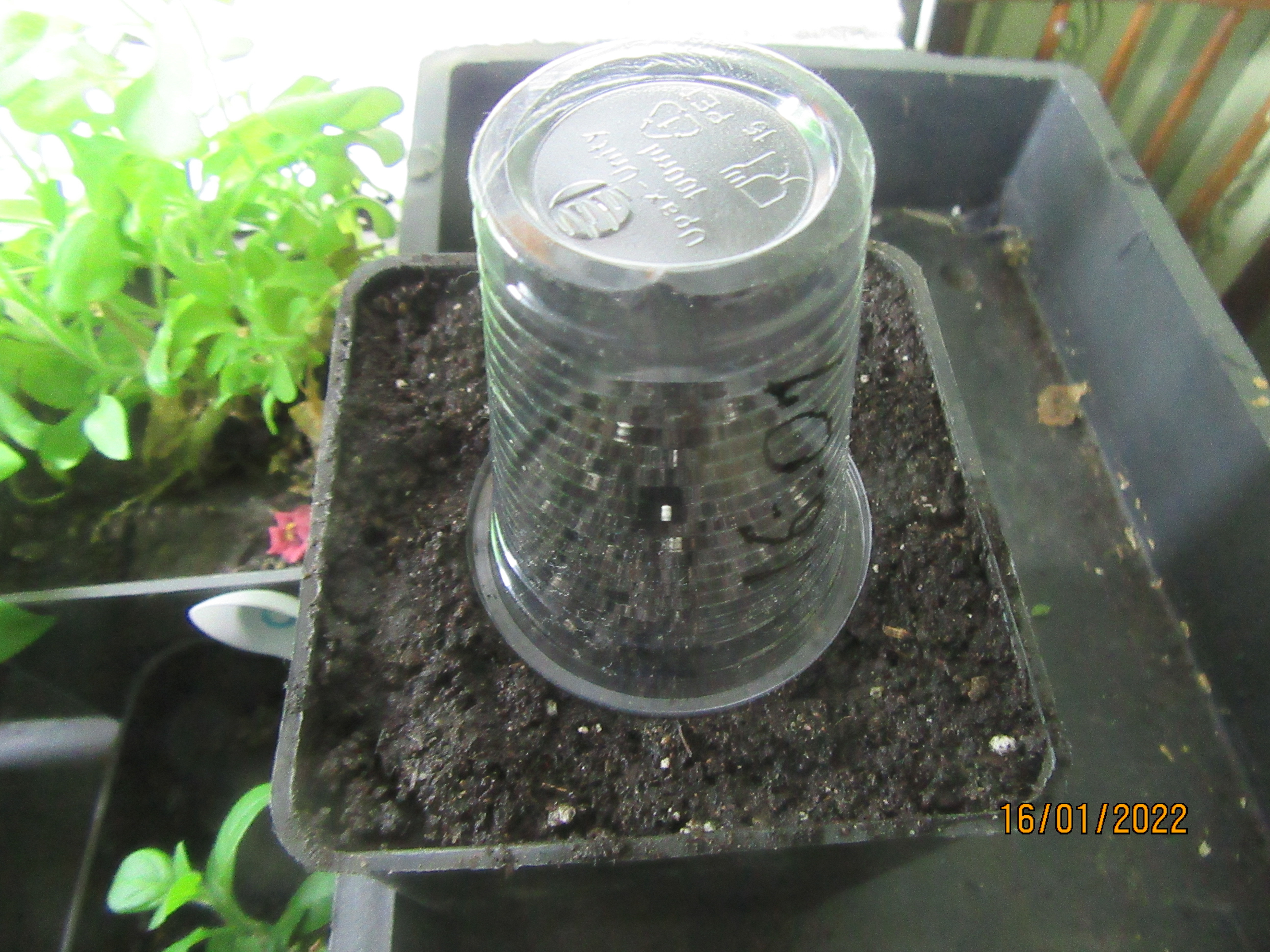 Посев как обычно для черенкования, без пикировки: беру емкость 800 мл, насыпаю грунт, состоящий из садовой земли + перегной в соотношении 1: 1, посередине делаю пальцем углубление размером с наперсток, это углубление заполняю грунтом «Терра-вита», поливаю, сверху кладу одно семечко петунии + накрываю прозрачным одноразовым стаканчиком.