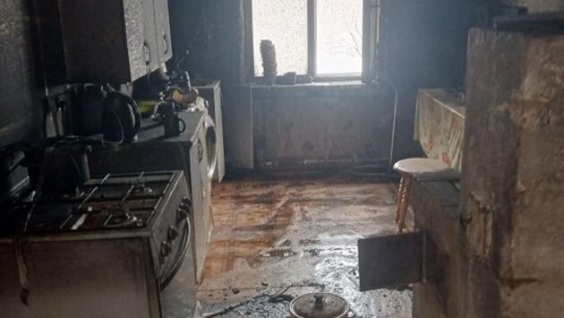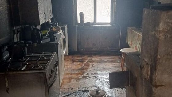 Из топки произошёл мощный выброс пламени. Загорелись дверь, стены и потолок кухни.