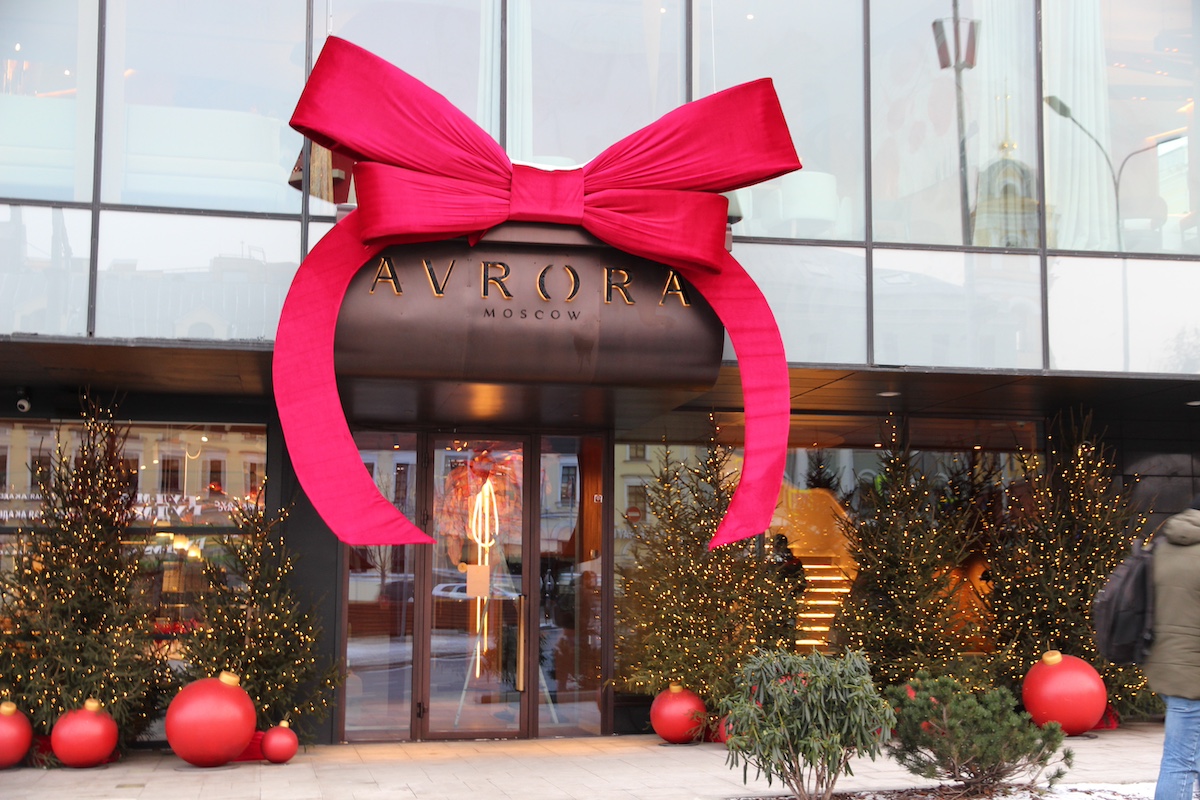 Входную группу Avrora, словно коробку с подарком, венчает четырехметровый красный бант с длинными лентами. В случае с «Авророй» это не просто эффектный декораторский прием, но и отсылка и к праздничной программе ресторана: команда AVA Team подготовила насыщенную событиями новогоднюю ночь, которая включает не только выступления Валерия Сюткина, кавер-групп и диджей-сеты, но и подарки всем гостям.