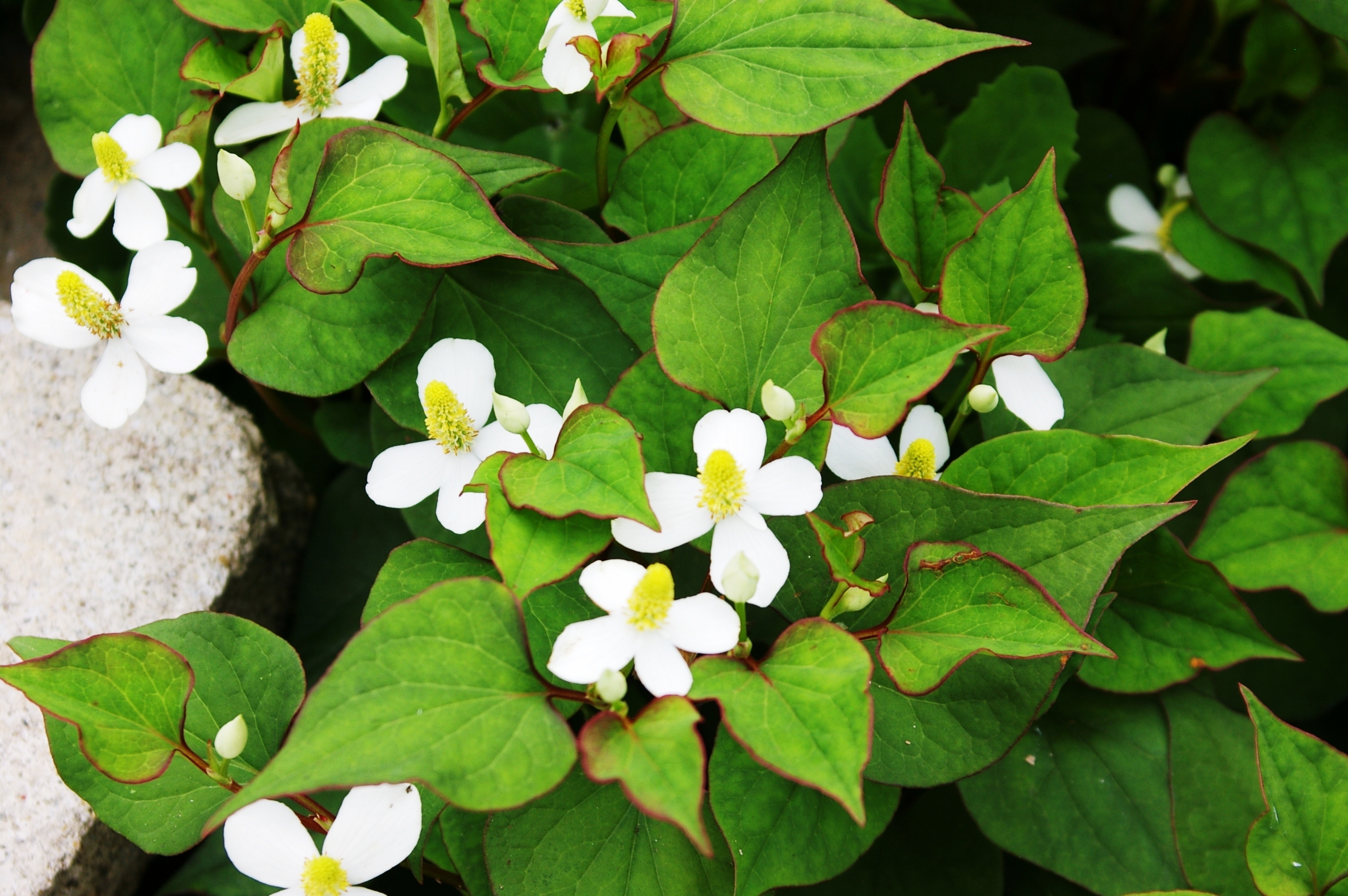 Это травянистый ароматический многолетник из почти незнакомого нам семейства Савруровые (Saururaceae) родом из Китая, Японии. Хауттюйния сердцелистная (Houttuynia cordata) пока еще редкий гость в дачных цветниках.